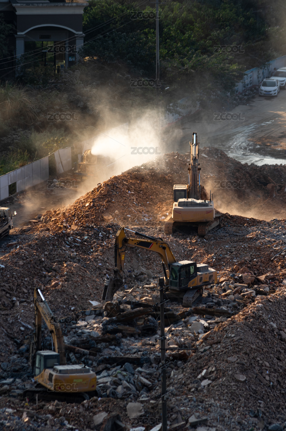 建筑工地上正在给挖土机喷雾稀释尘埃颗粒的喷雾车
