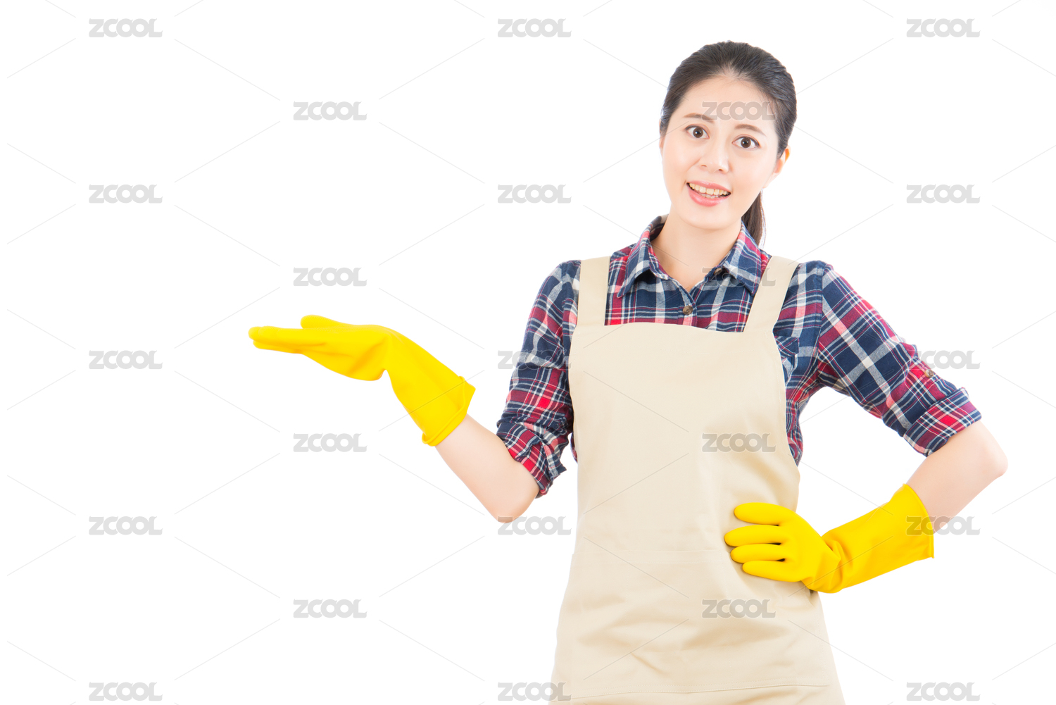 示出具有分离的在白色背景塑料手套的手呈现手势亚家庭主妇。美丽的新鲜活力的多民族中国的亚洲女模特。