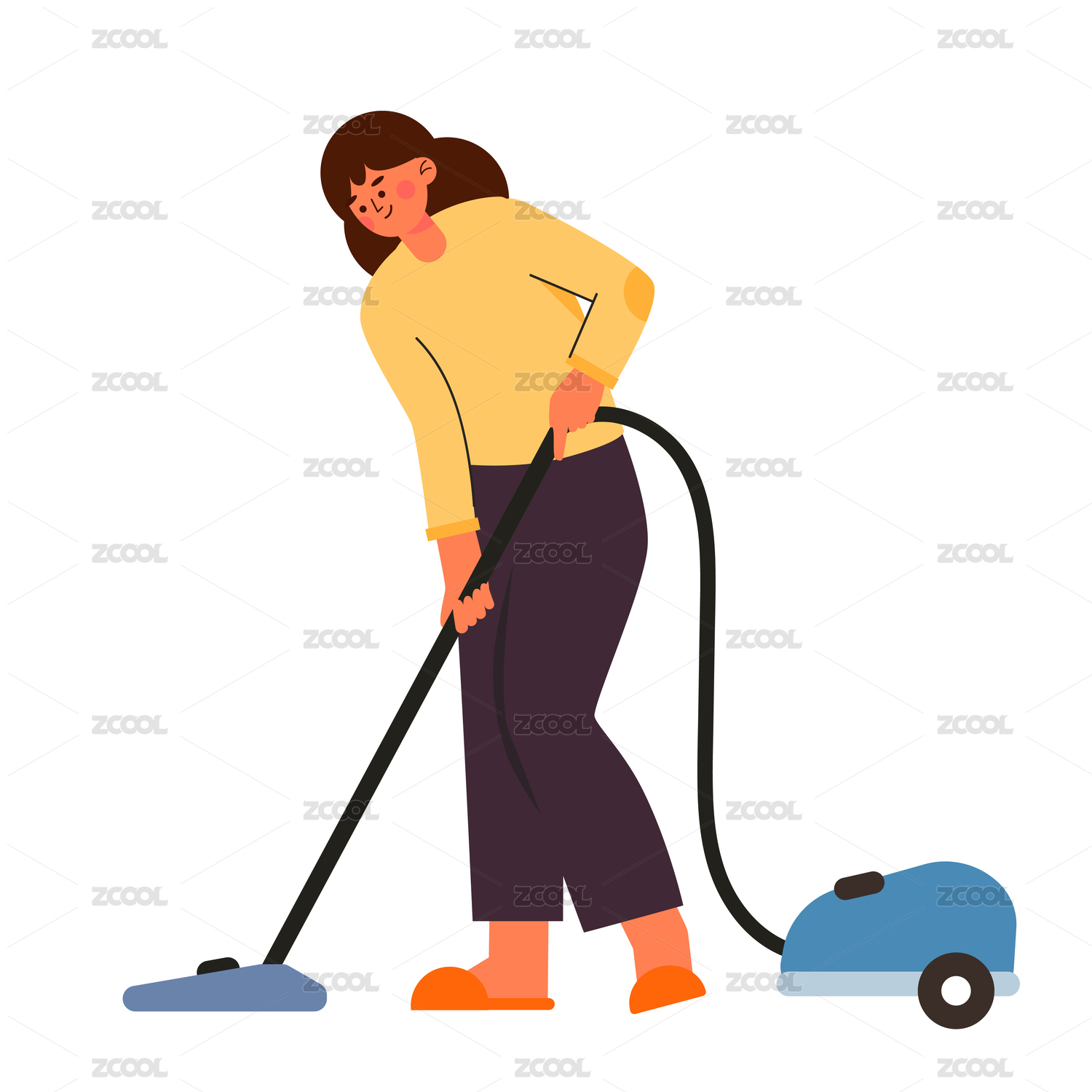 家庭主妇在家里用吸尘器打扫卫生矢量插画