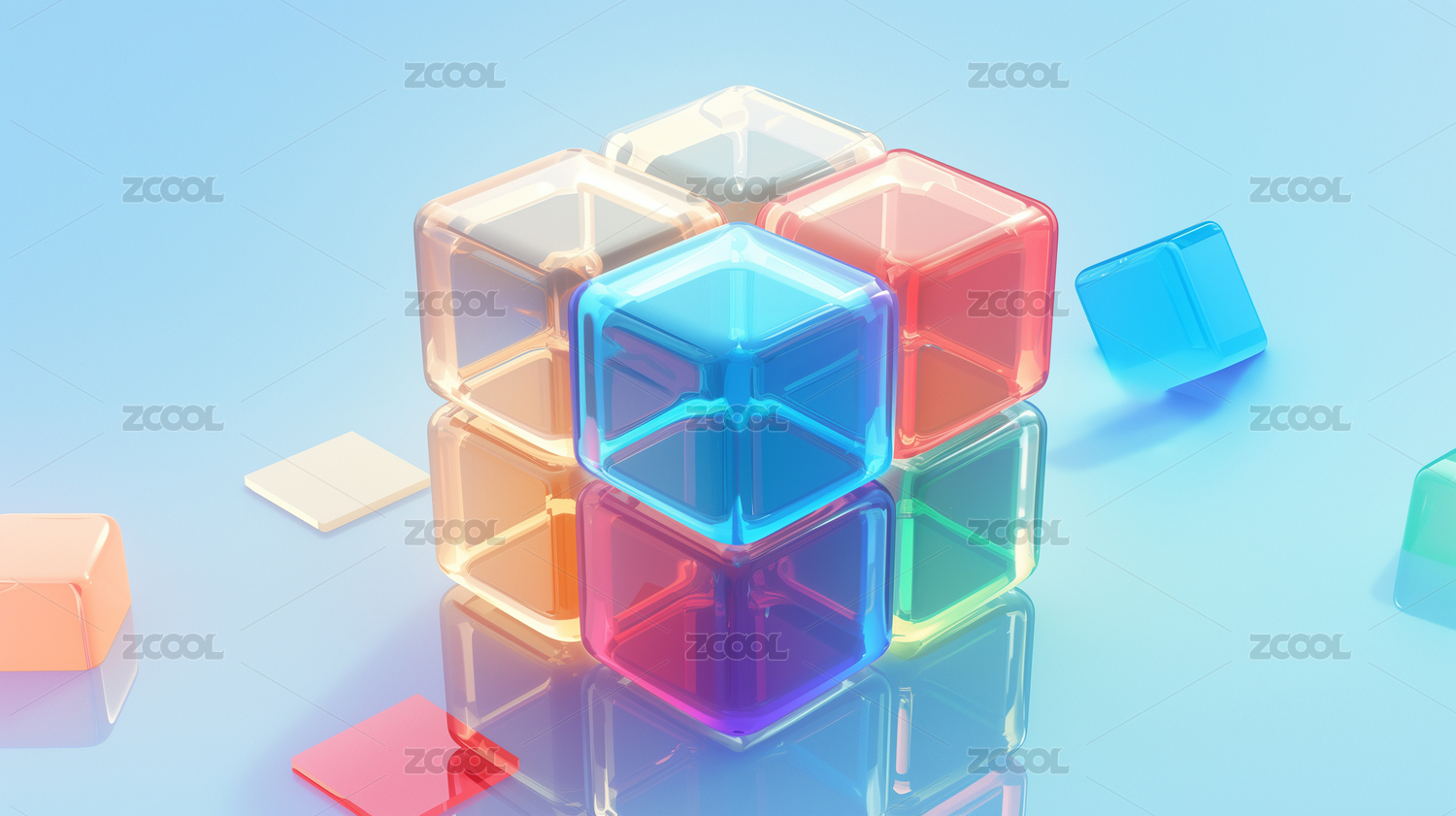 蓝底晶莹透亮荧光色立方体魔方3D立体插画