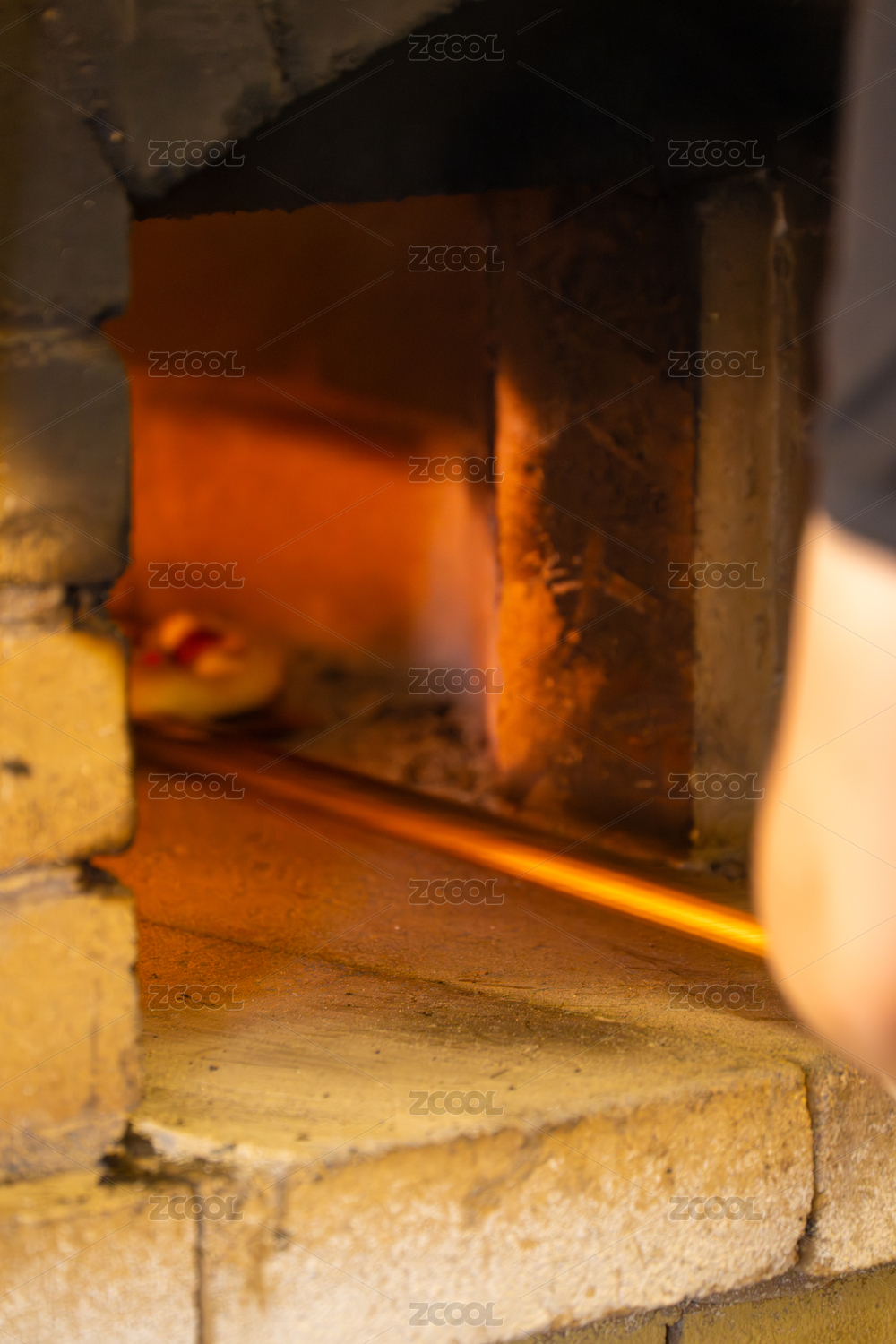 传统砖砌烤炉中的披萨烘烤场景
