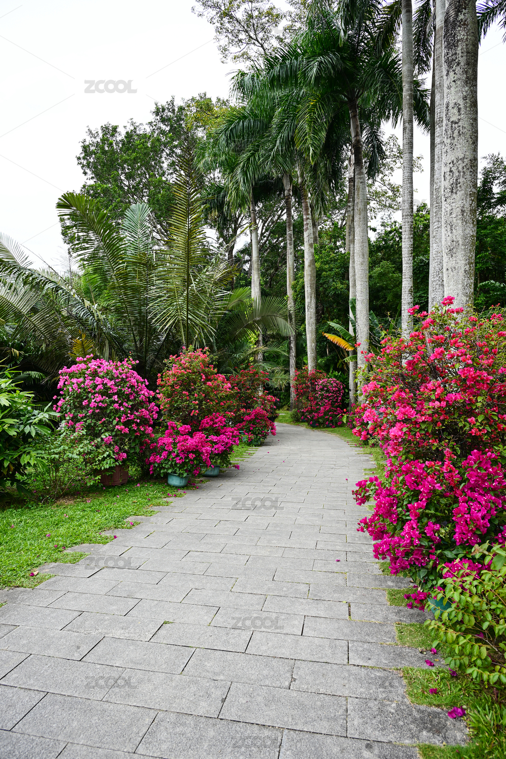 深圳仙湖植物园中繁花簇拥的石板小径景观