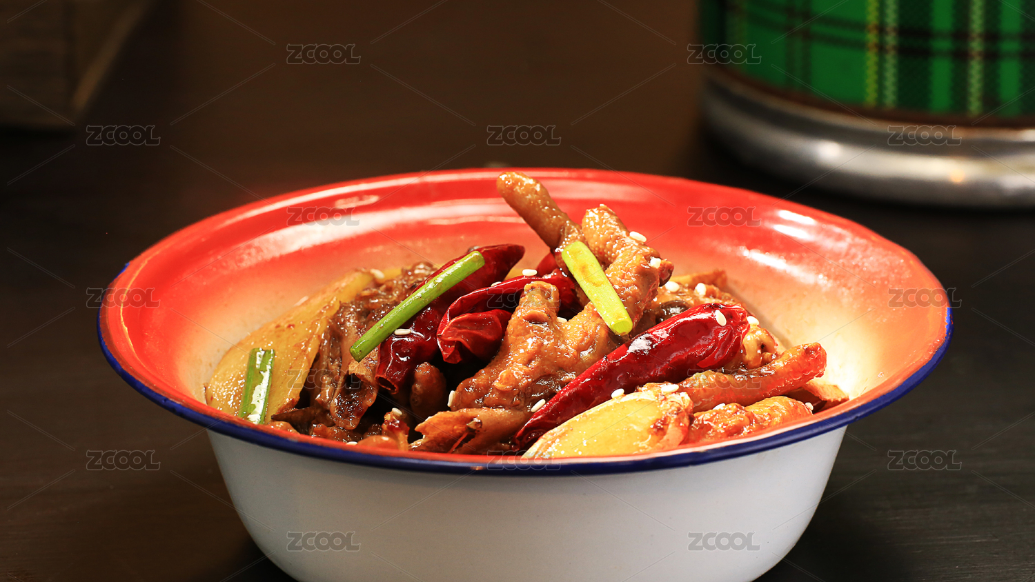 黑色木板上红色搪瓷碗中的姜辣凤爪