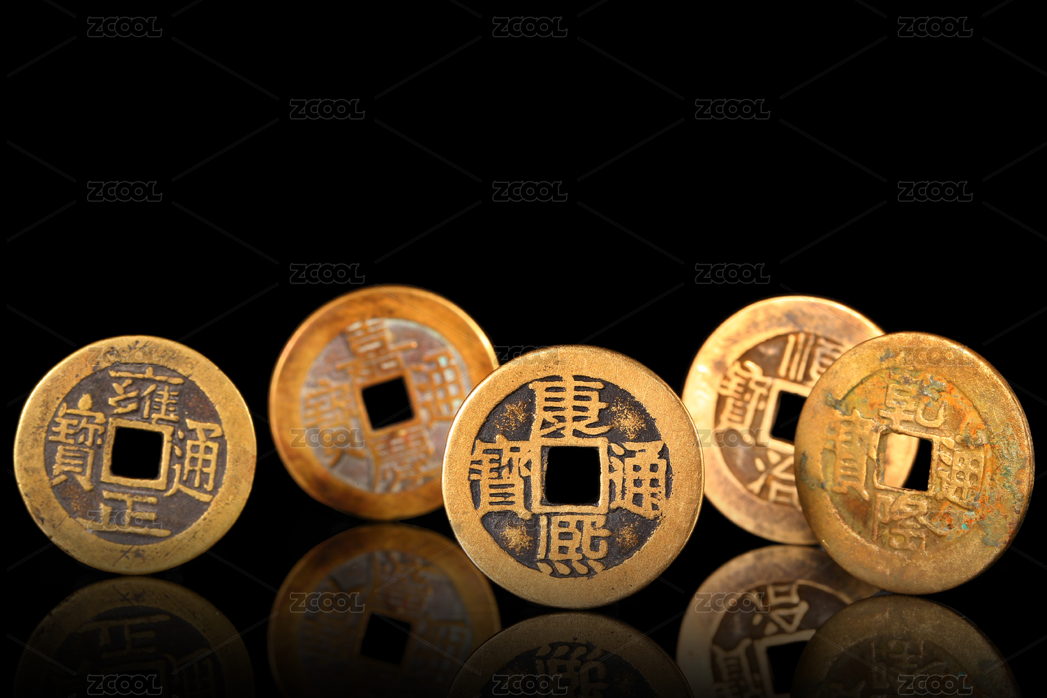 清代铜钱排列在黑色背景上,形成相应的倒影,这些铜钱分别是:顺治,康熙,雍正,乾隆,嘉庆年间的交易货币