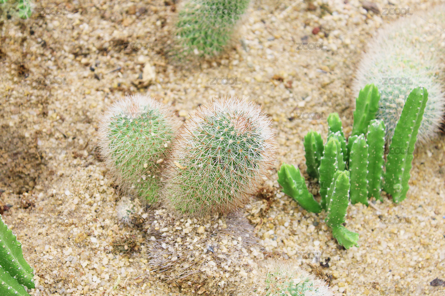 沙地里几颗野生绿色金手指仙人掌