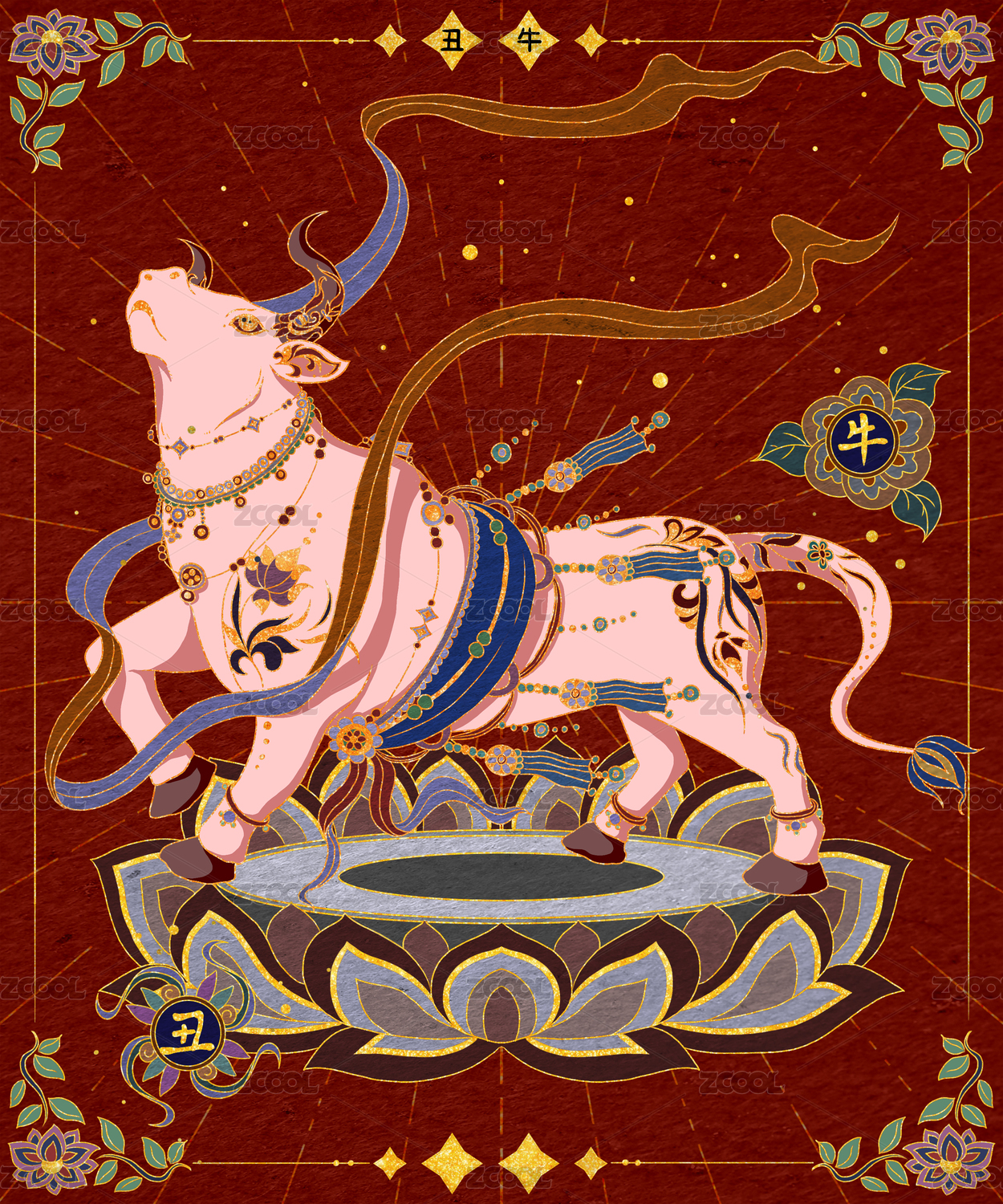 国潮丑牛十二生肖印花潮流装饰纹样卡通形象