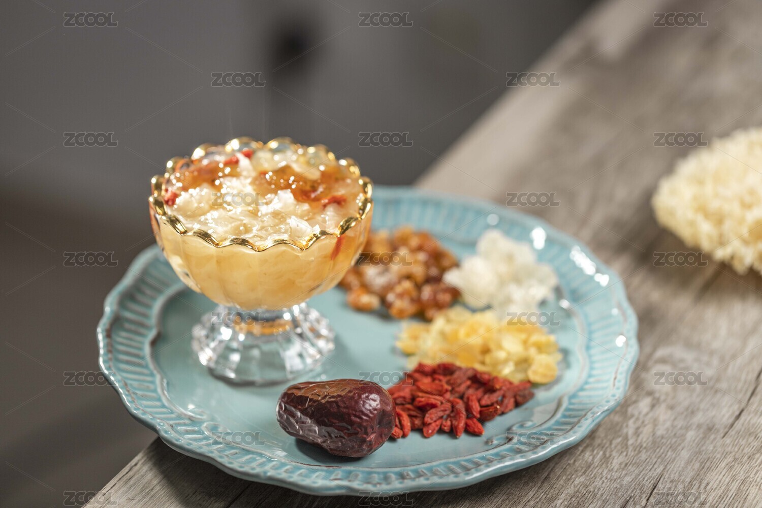浅色木纹桌上放着一碗桃胶皂角米汤羹