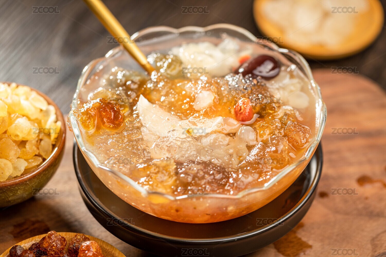 暗色木纹桌面上放着一碗桃胶雪燕皂角米汤羹