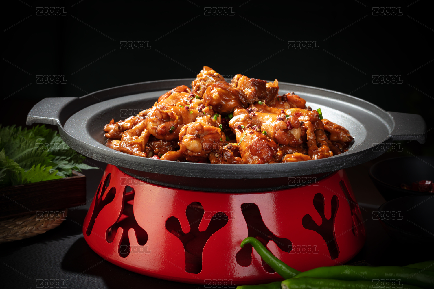 黑铁锅里面的麻辣鸡腿煲红烧鸡腿