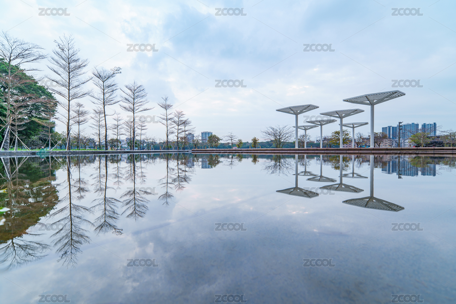 中国湖南长沙橘子洲池塘水景及城市倒影