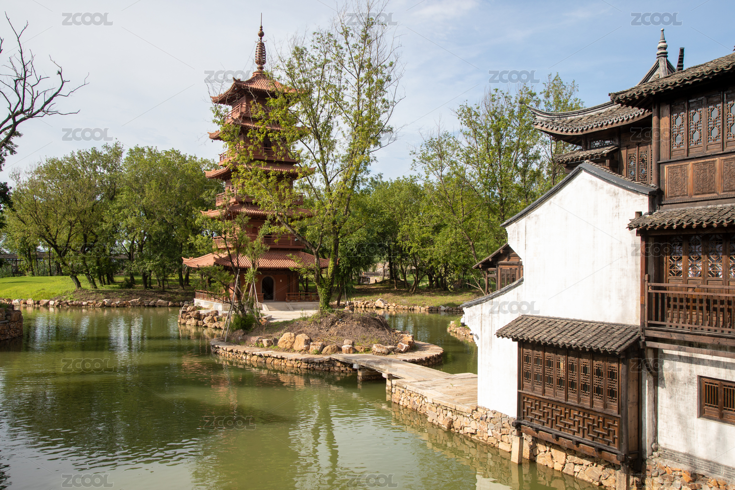 中式桥梁与现代建筑旁的水景