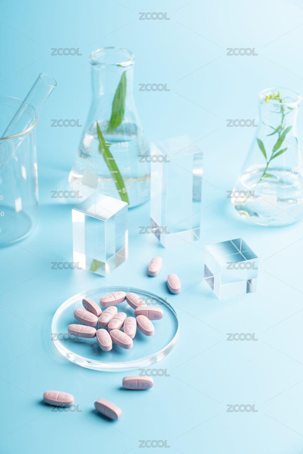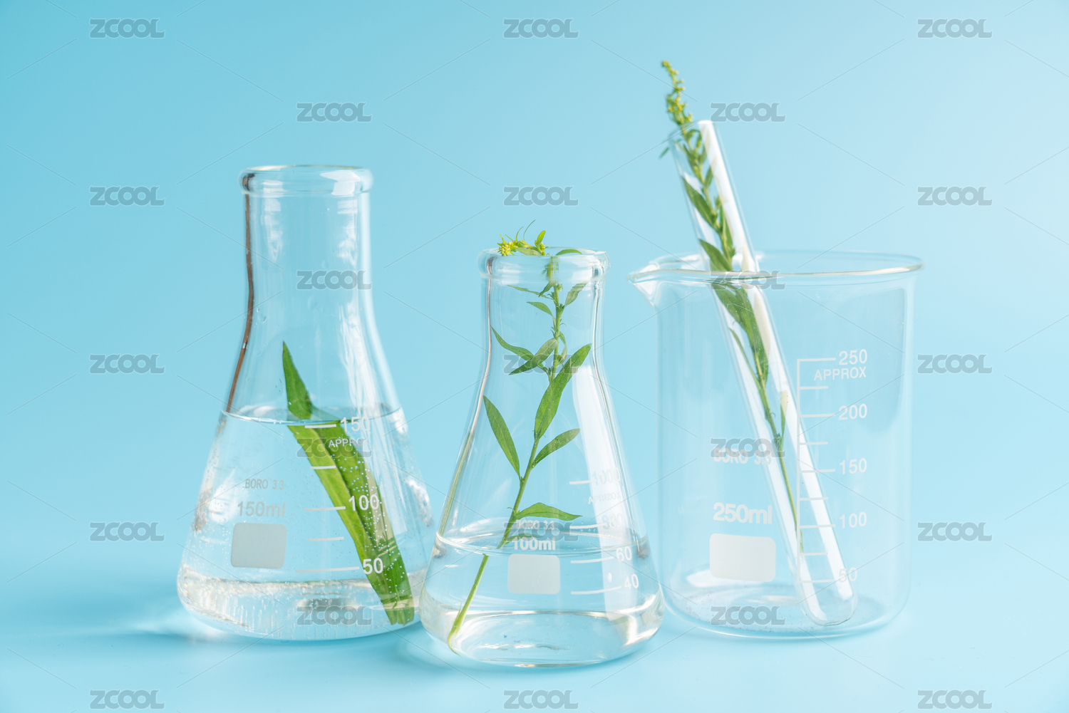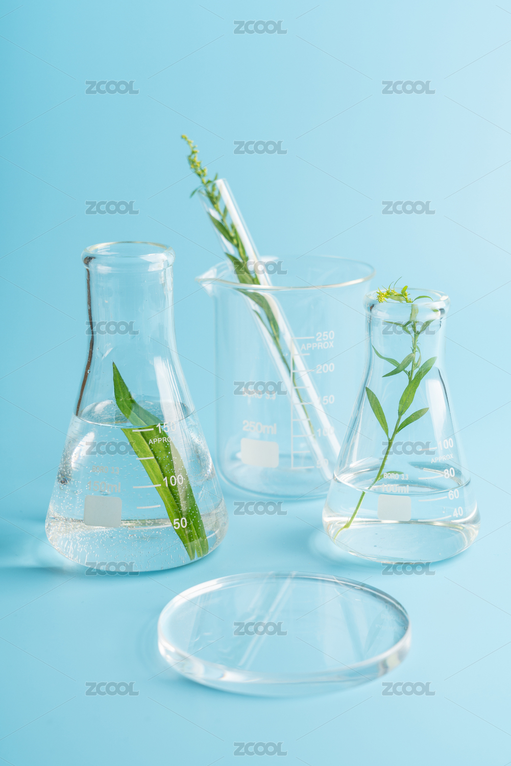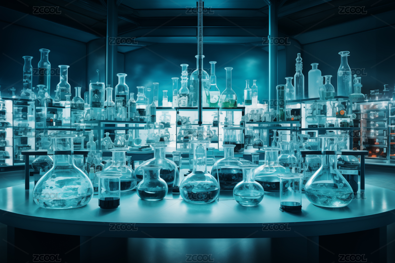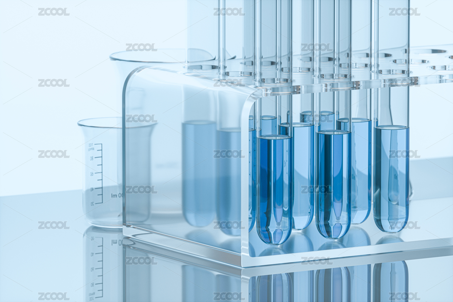 蓝色背景中的医疗科研实验常用玻璃器皿