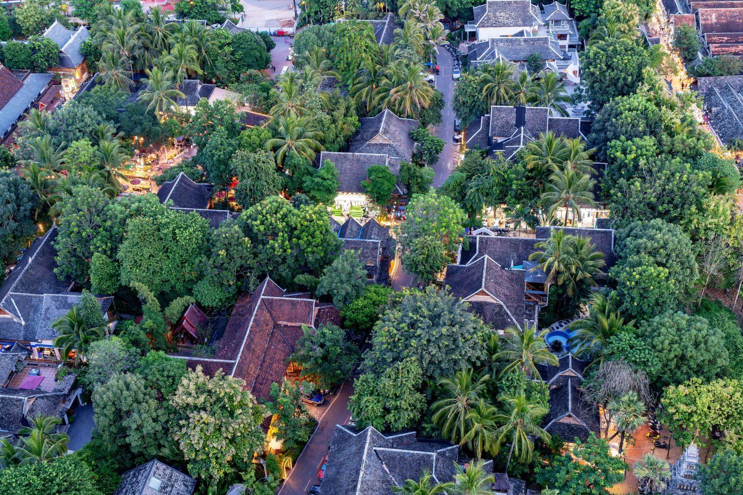 西双版纳景洪市告庄星光夜市日落黄昏俯拍