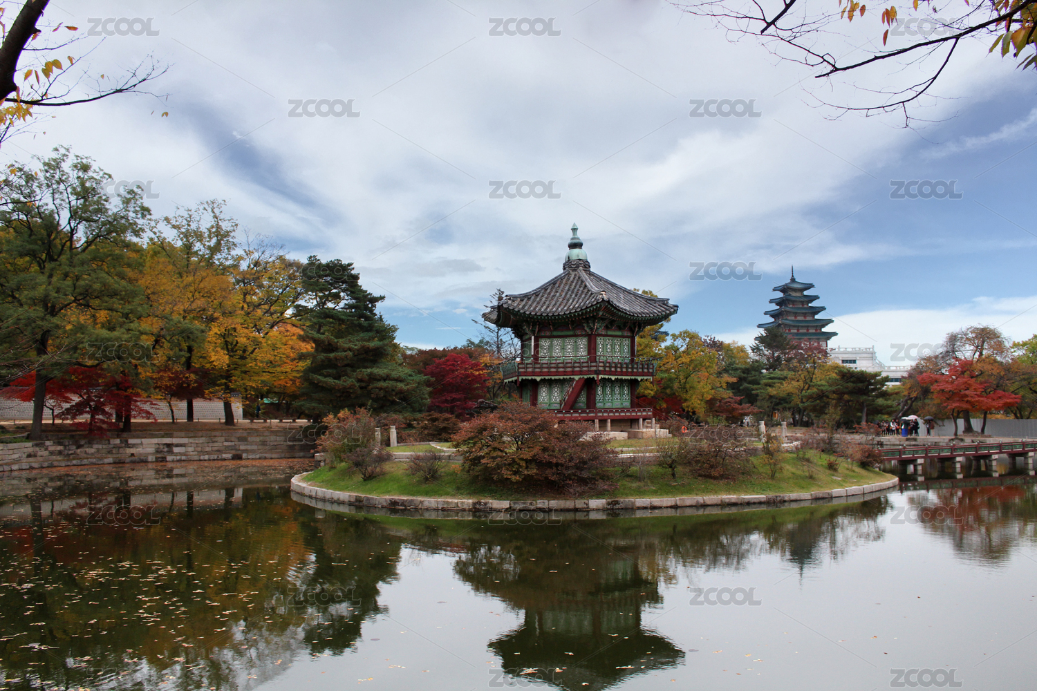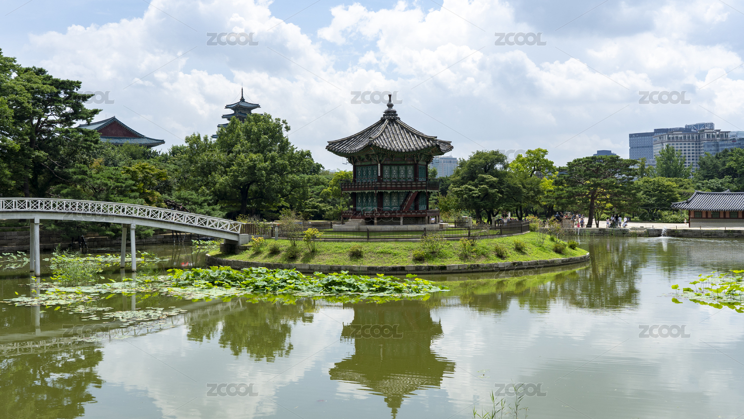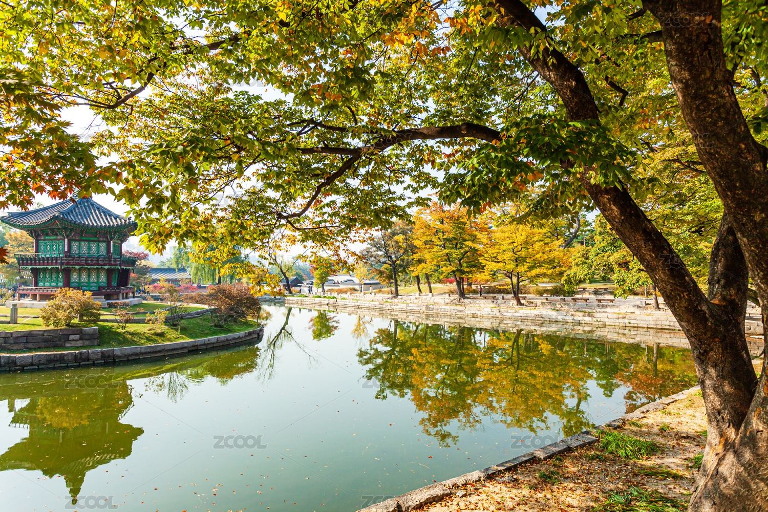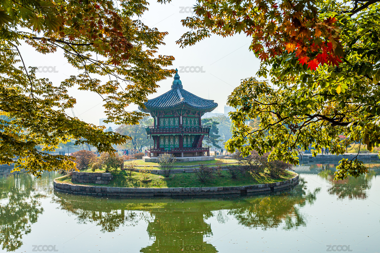 亚洲韩国首尔景福宫后花园的湖面楼亭