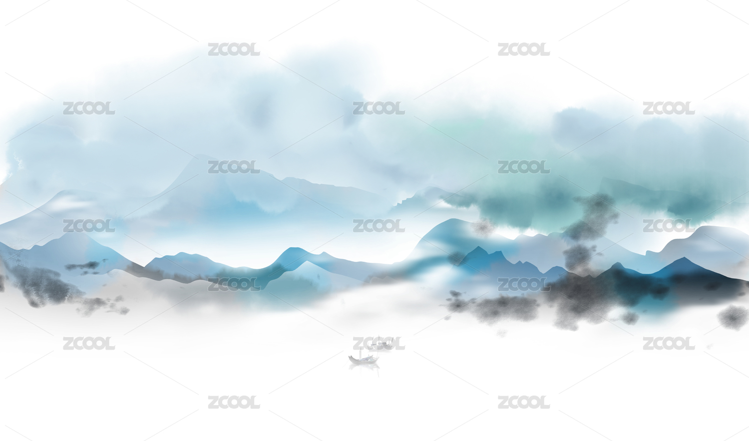 中国风淡雅山水画 冰蓝色云海意境山水画