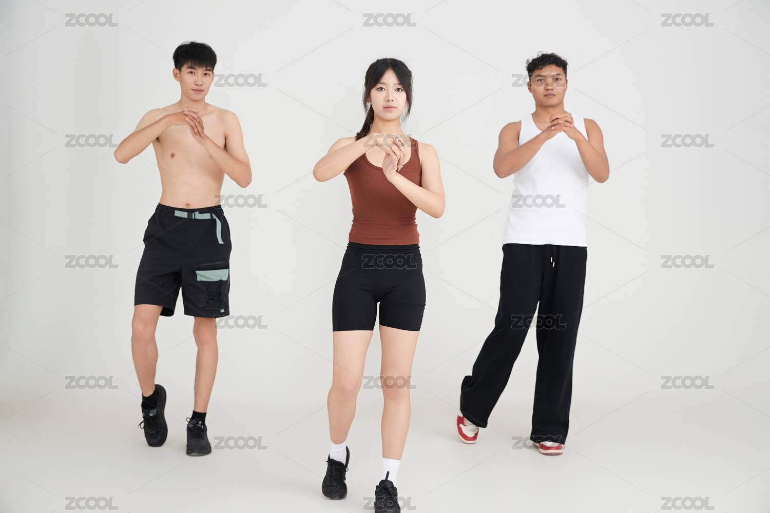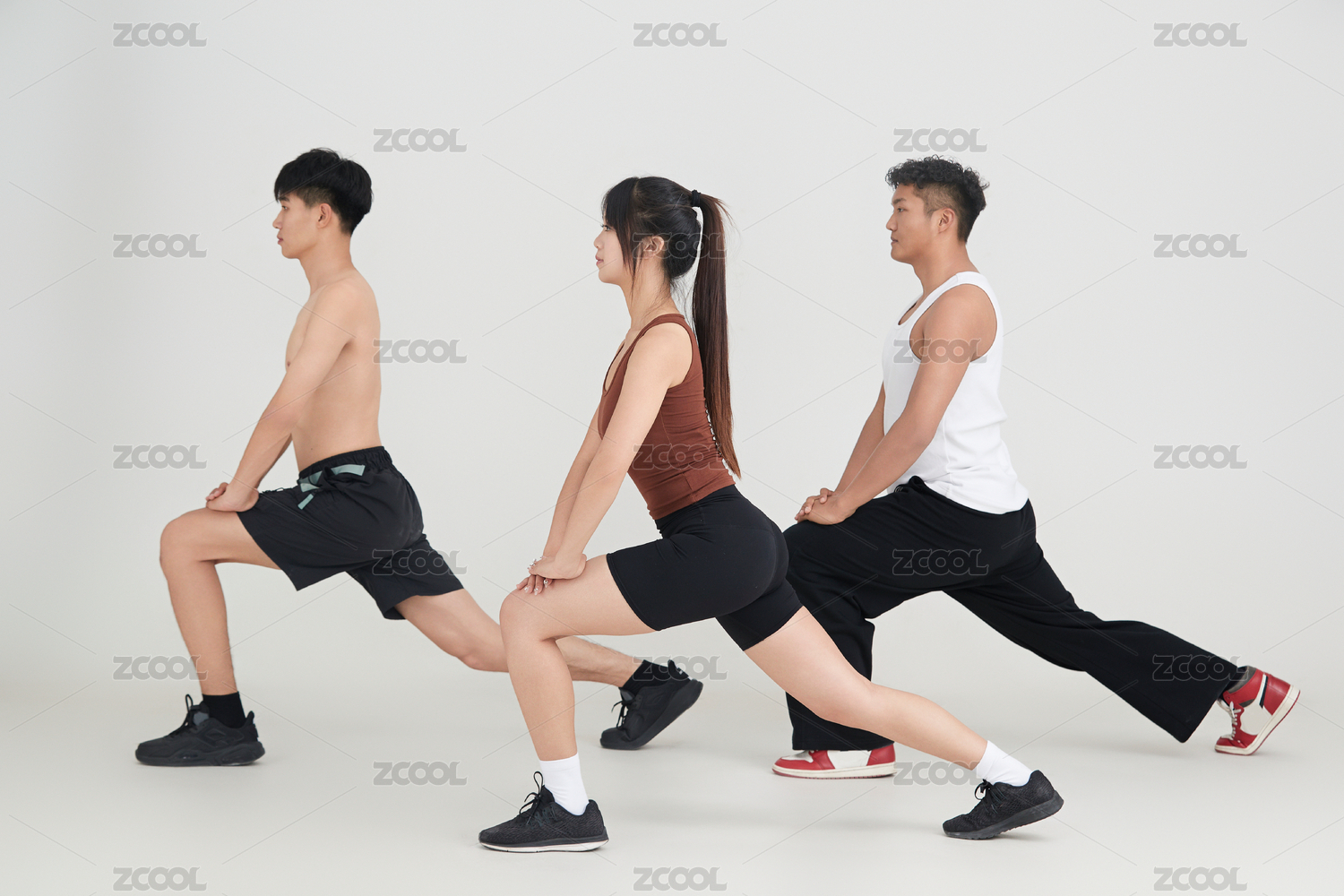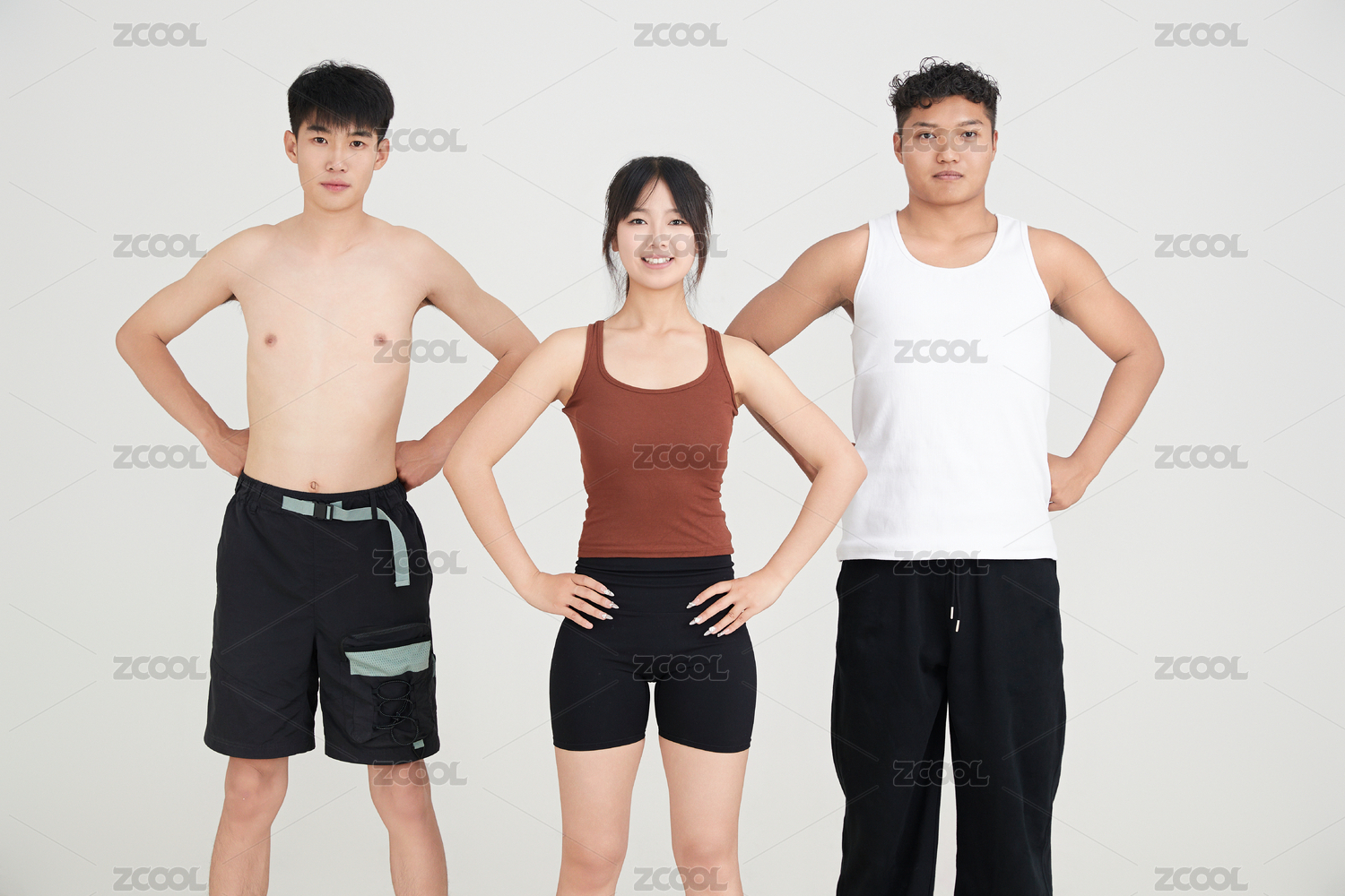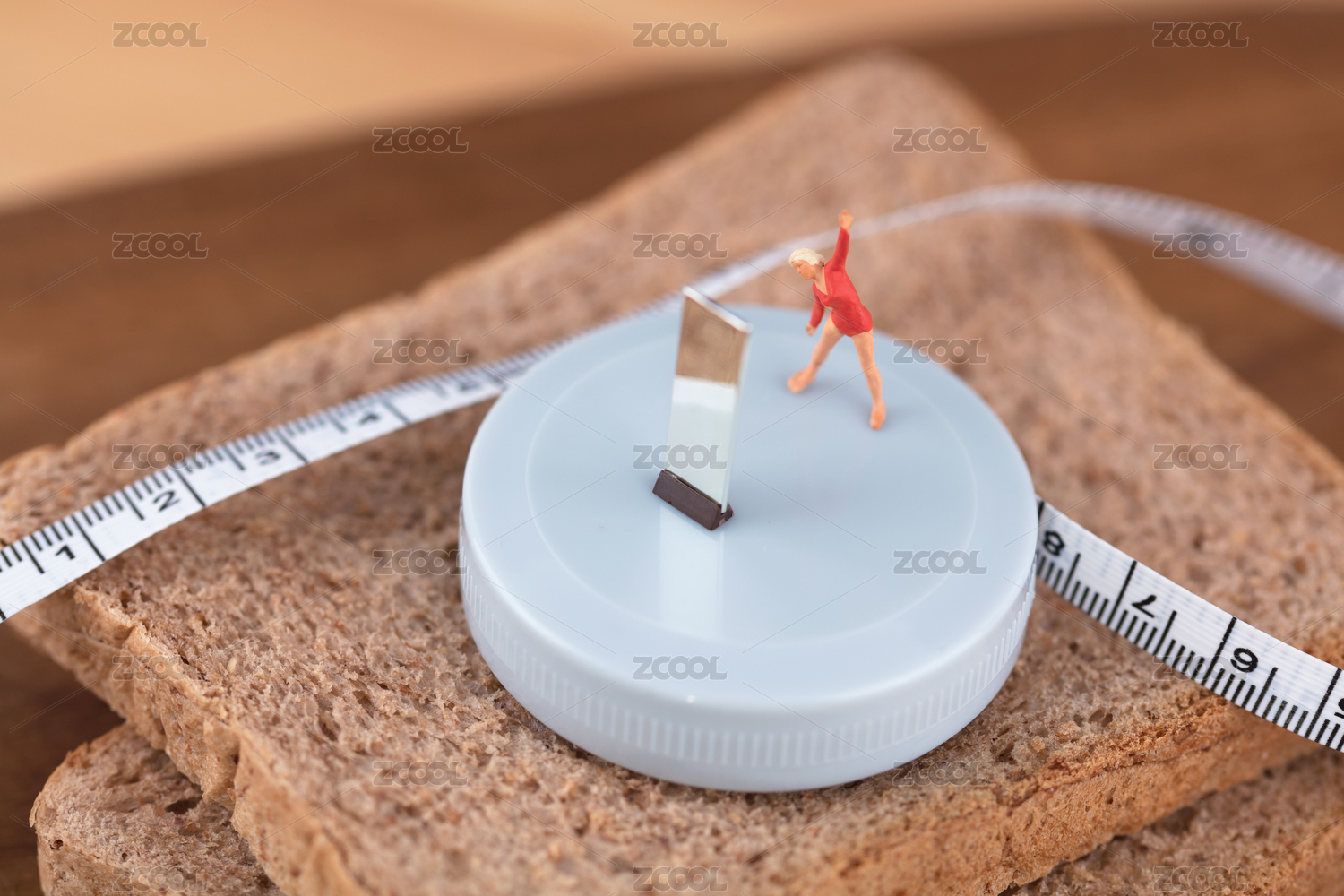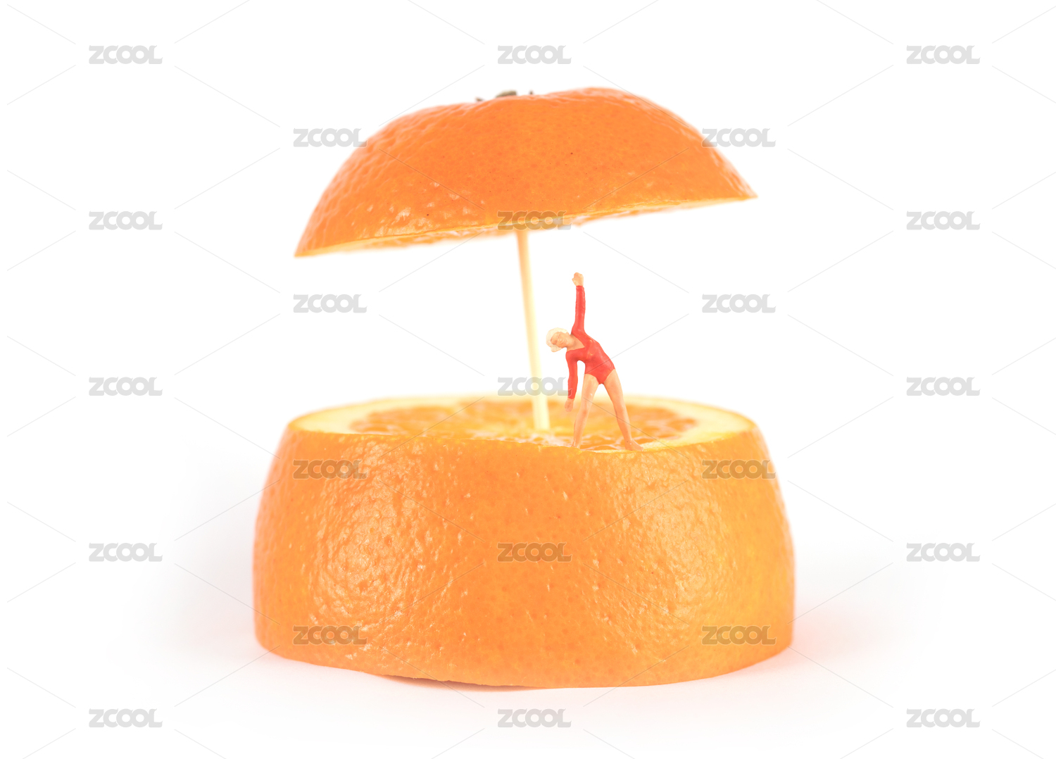 白背景上微缩的美女人偶在橙子上锻炼身体
