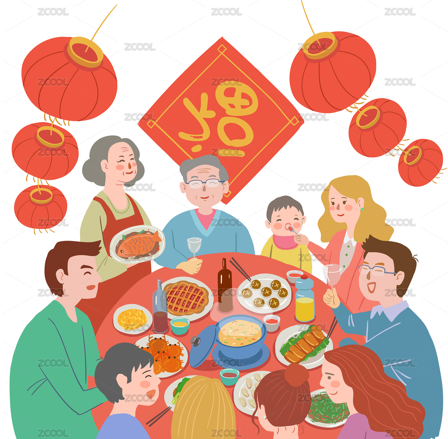 欢乐吃年夜饭的一家人 新年合家欢吃团圆饭插画