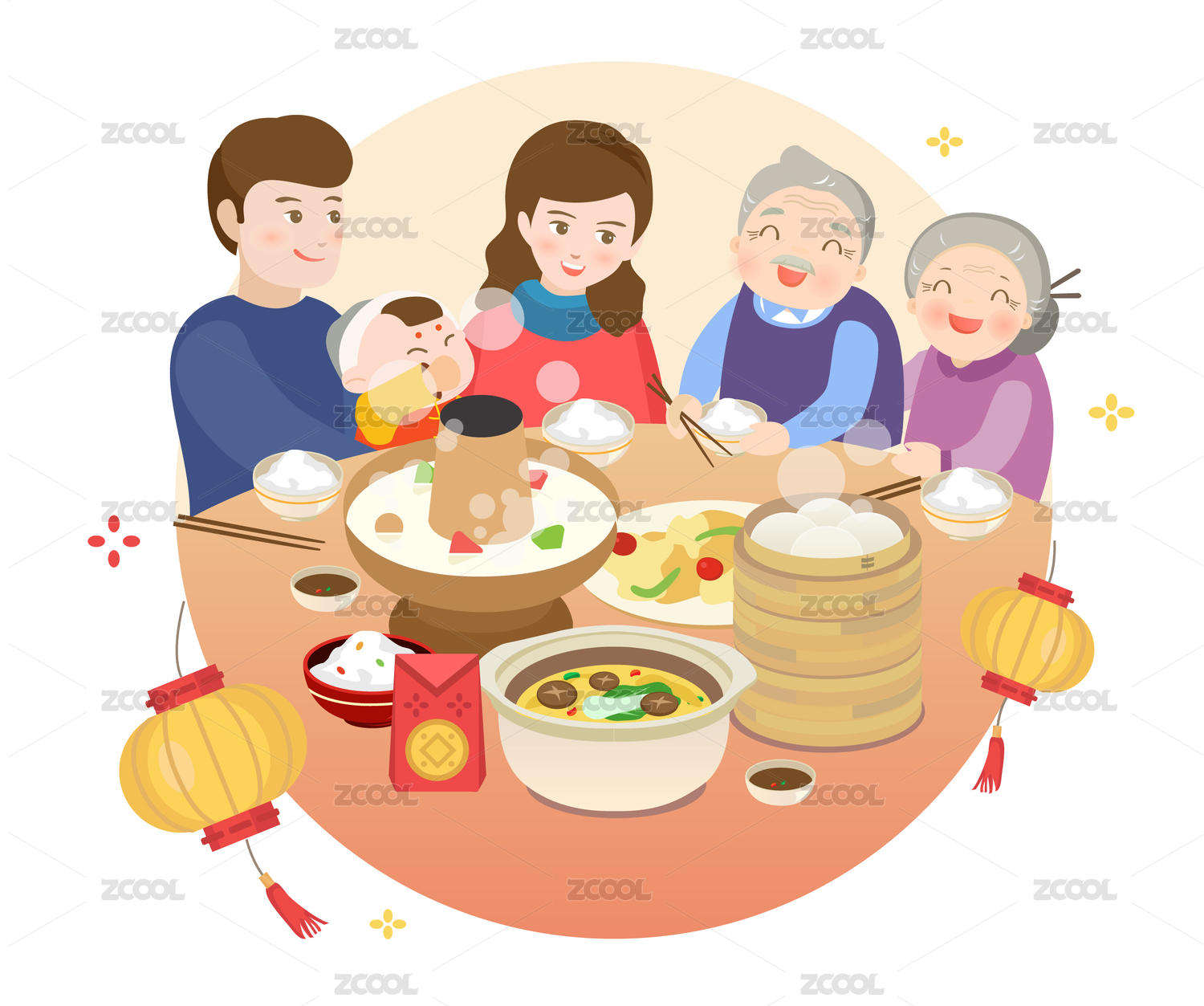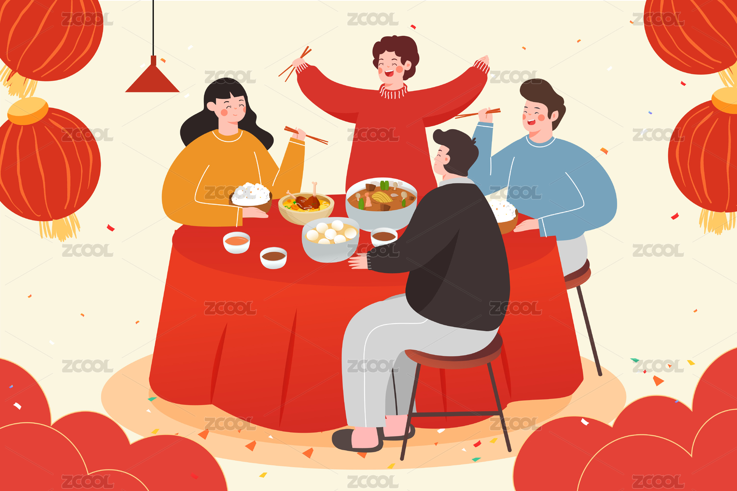 2020年新年年俗春节年夜饭团圆饭家人卡通中国风矢量背景插画