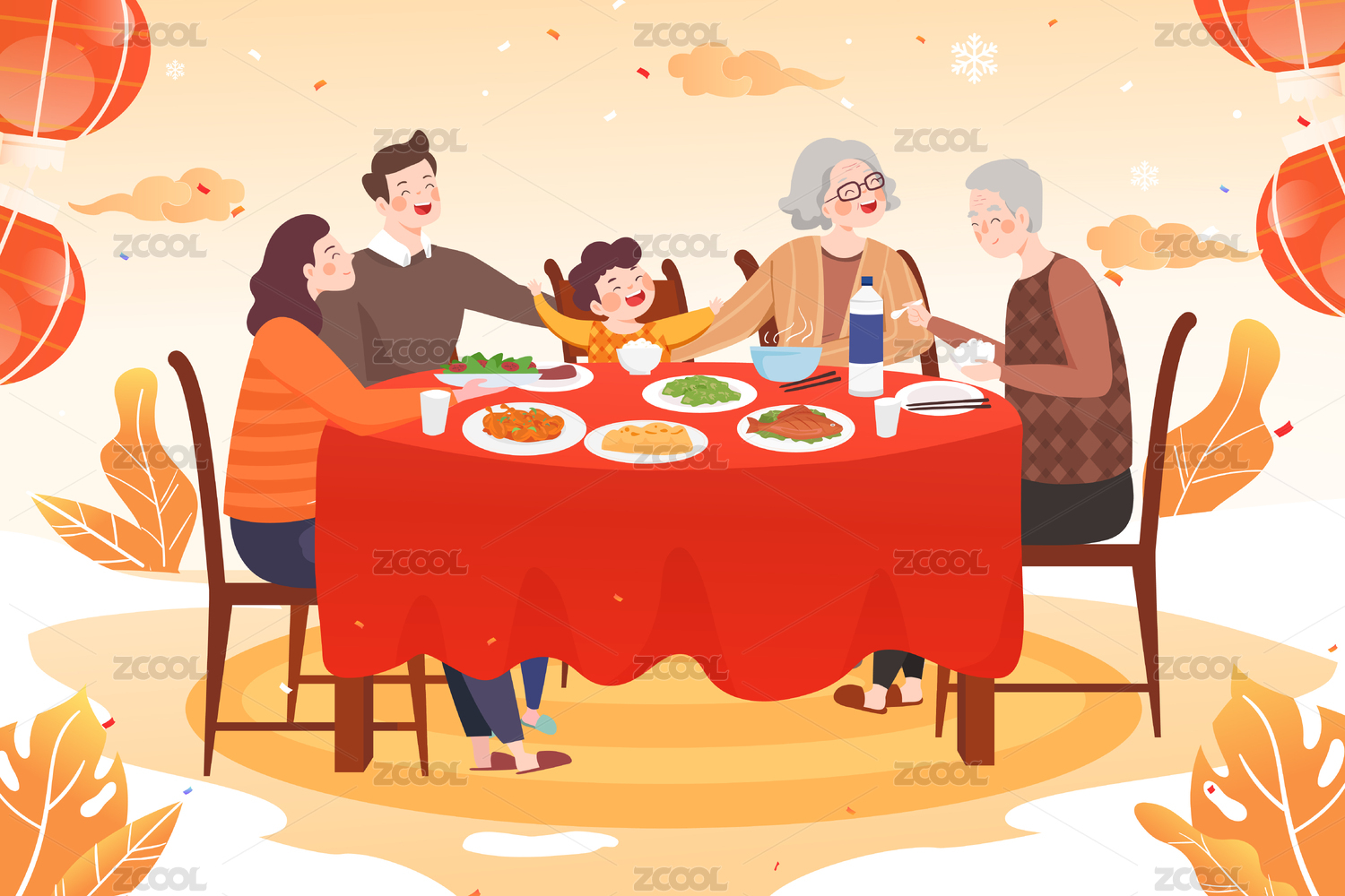 春节吃年夜饭的一家人 新年合家欢吃团圆饭插画 横版