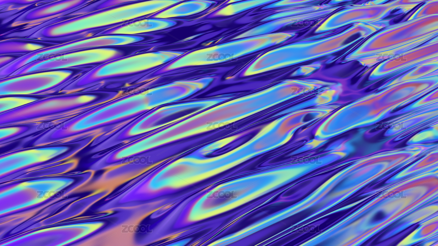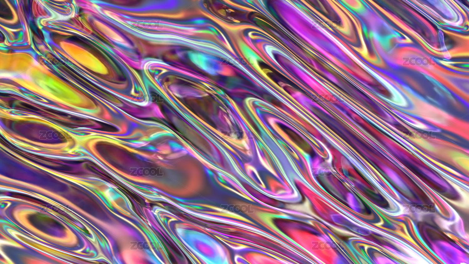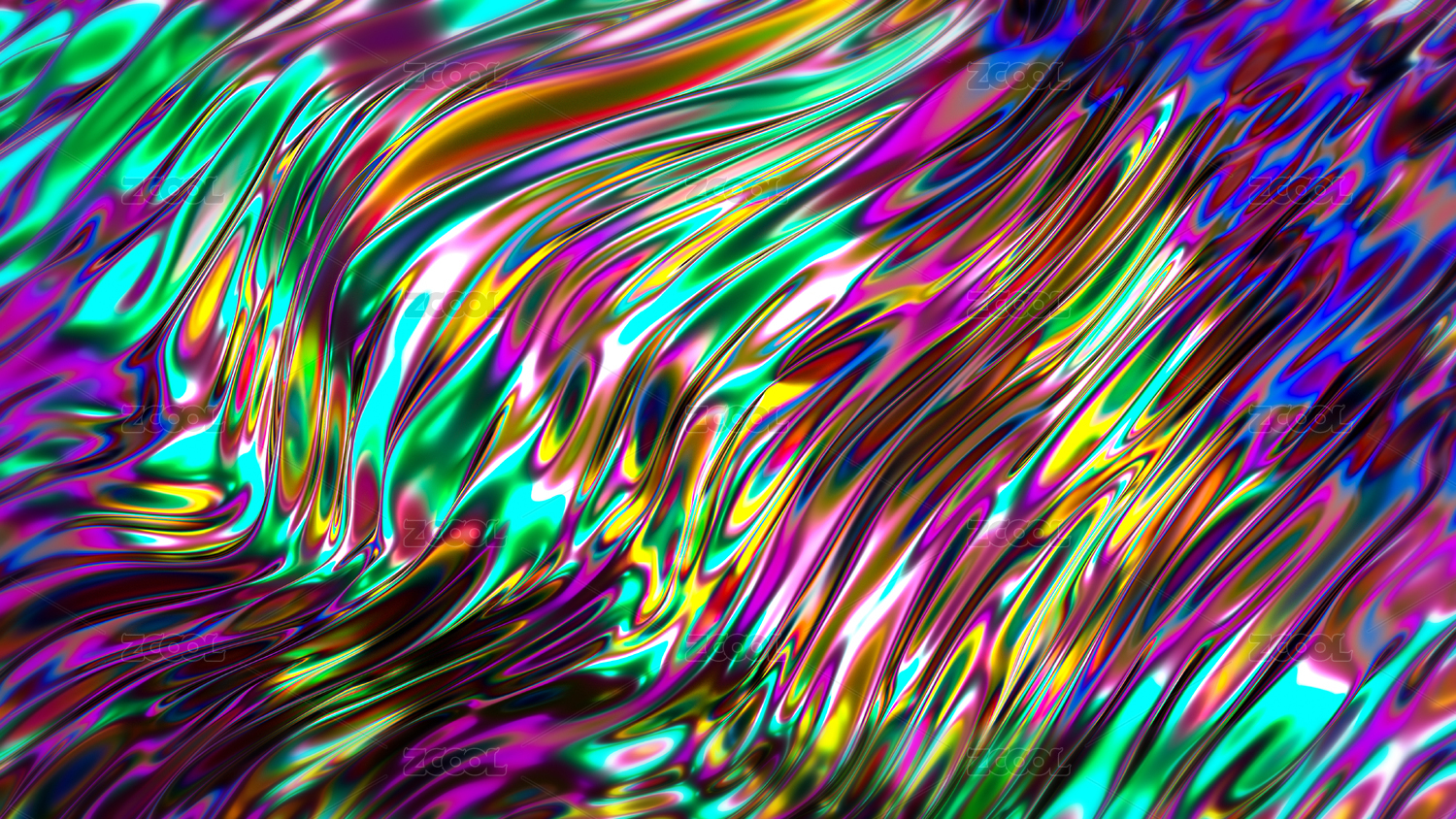 全息金属箔彩虹波、流动液体分形抽象纹理。