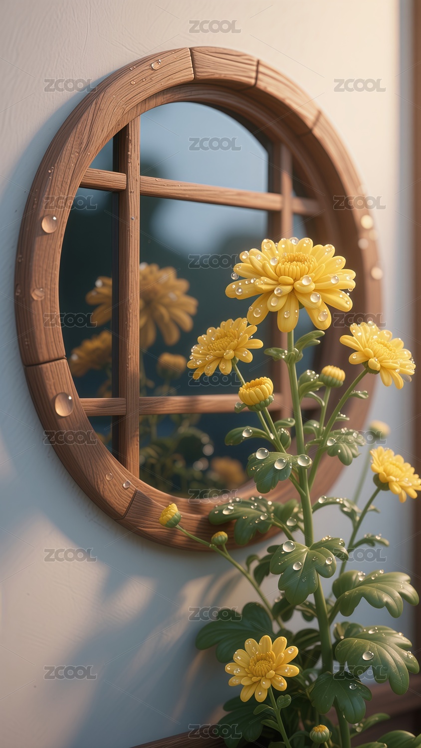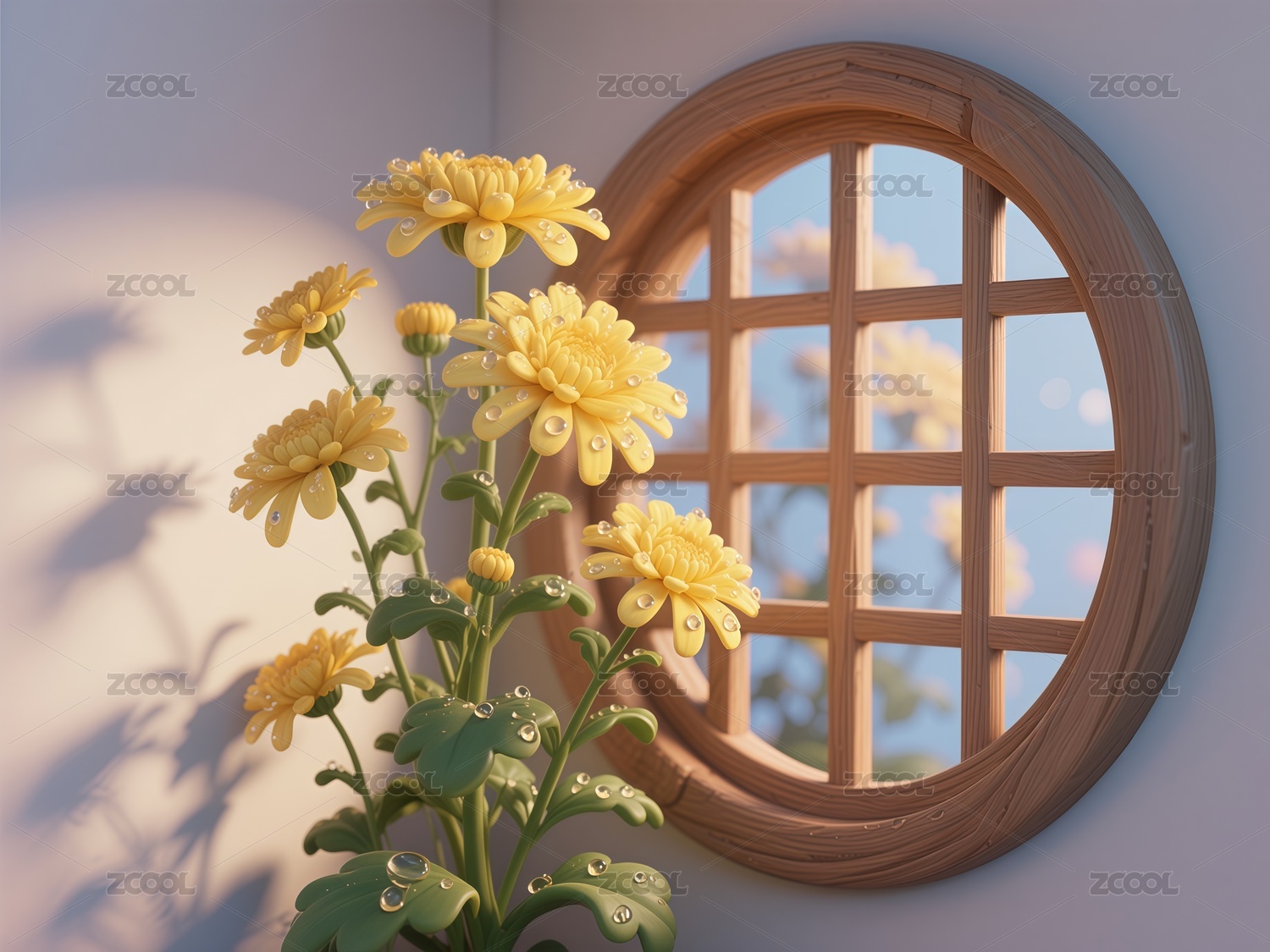 手捧鲜花身穿白色婚纱的新娘站在窗户边