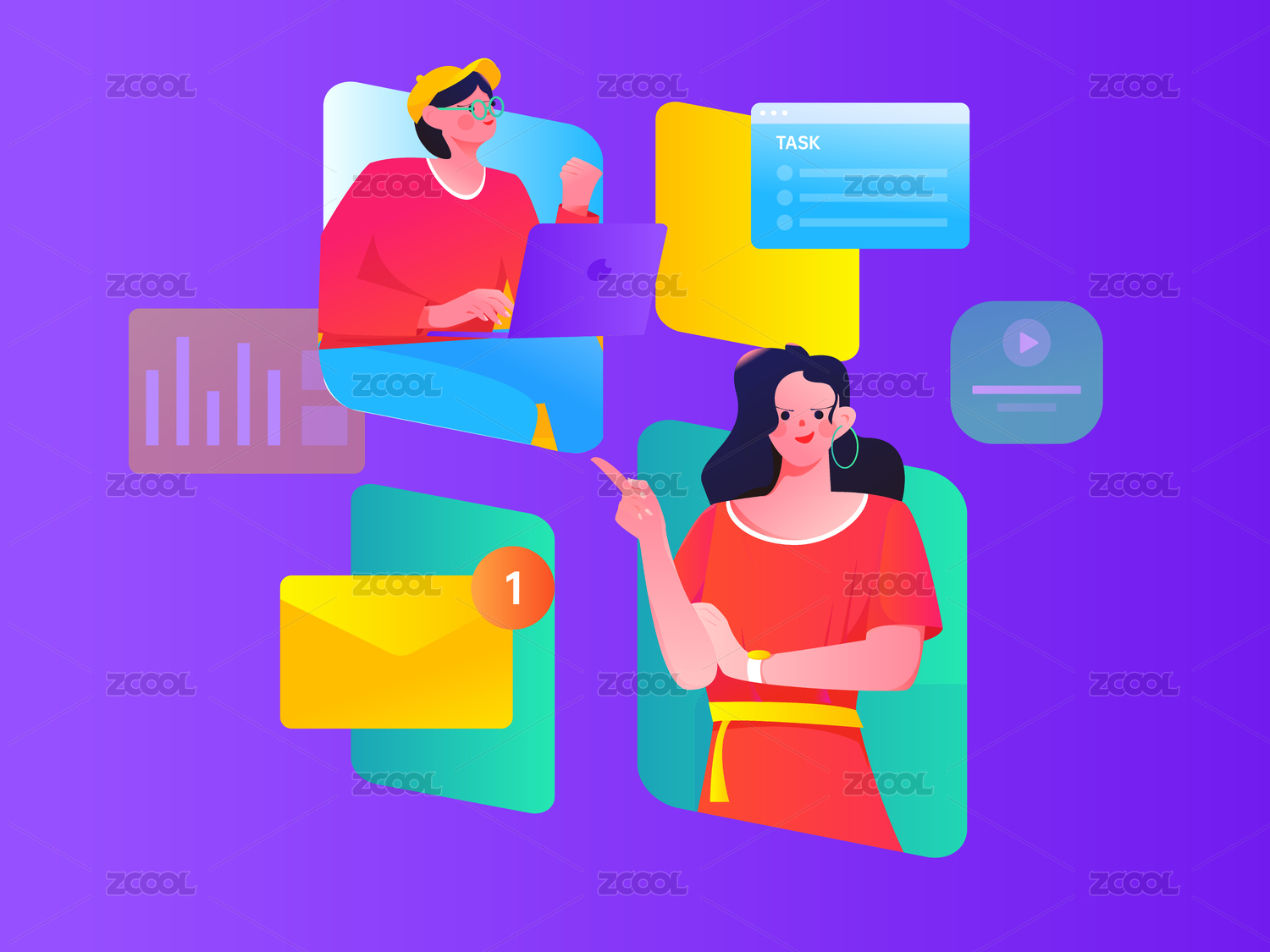 协作的卡通男女互联网矢量人物场景插画
