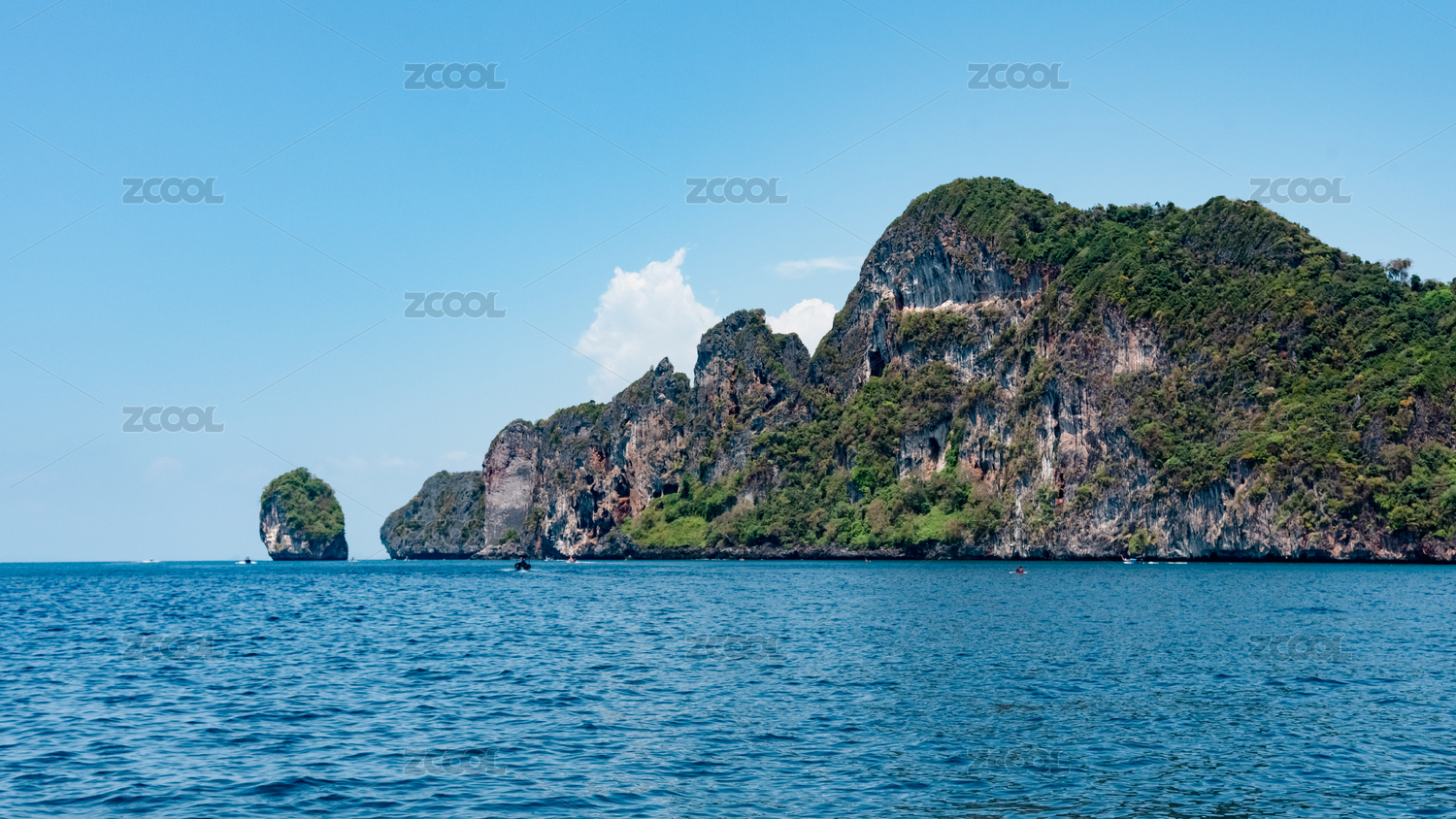 泰国小皮皮岛 游船漂浮在蓝色的水面上 后面是小岛耸立