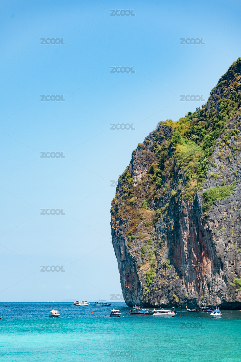 泰国皮皮岛周围垂直的山体下是蓝色的大海