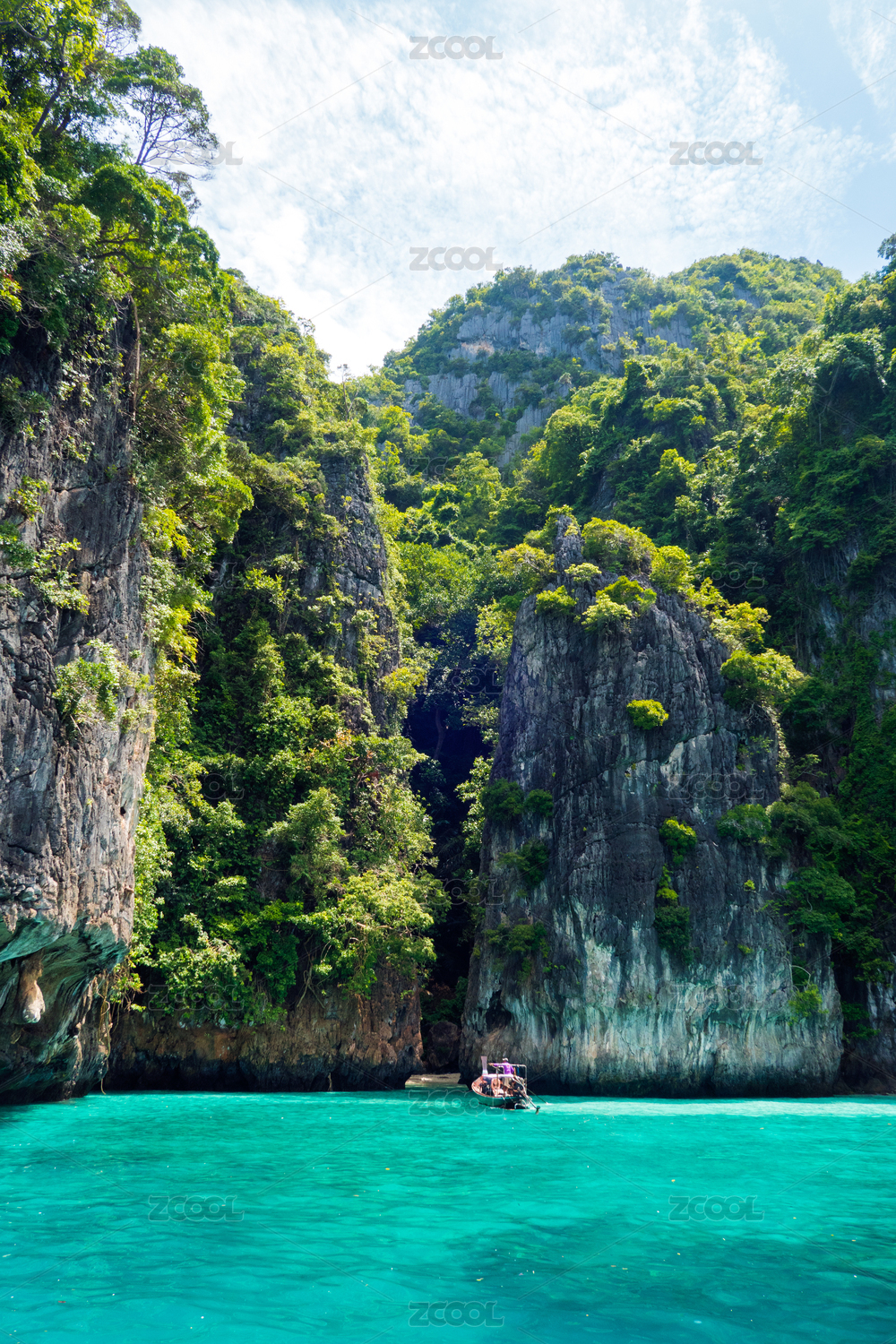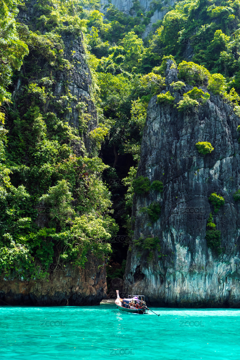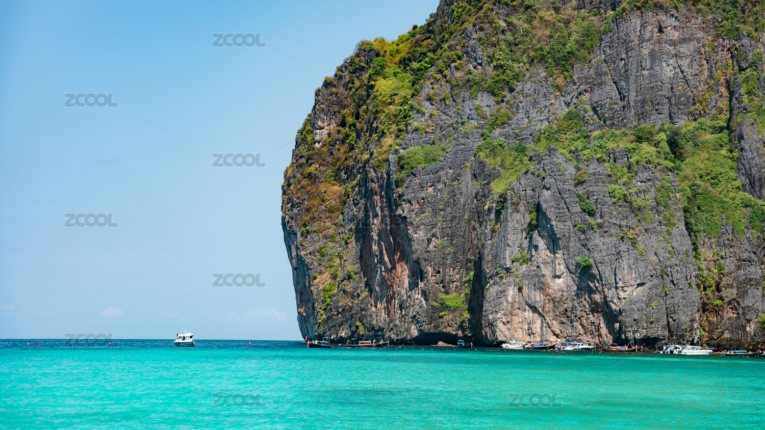 泰国皮皮岛 游船停靠在海边 悬崖下