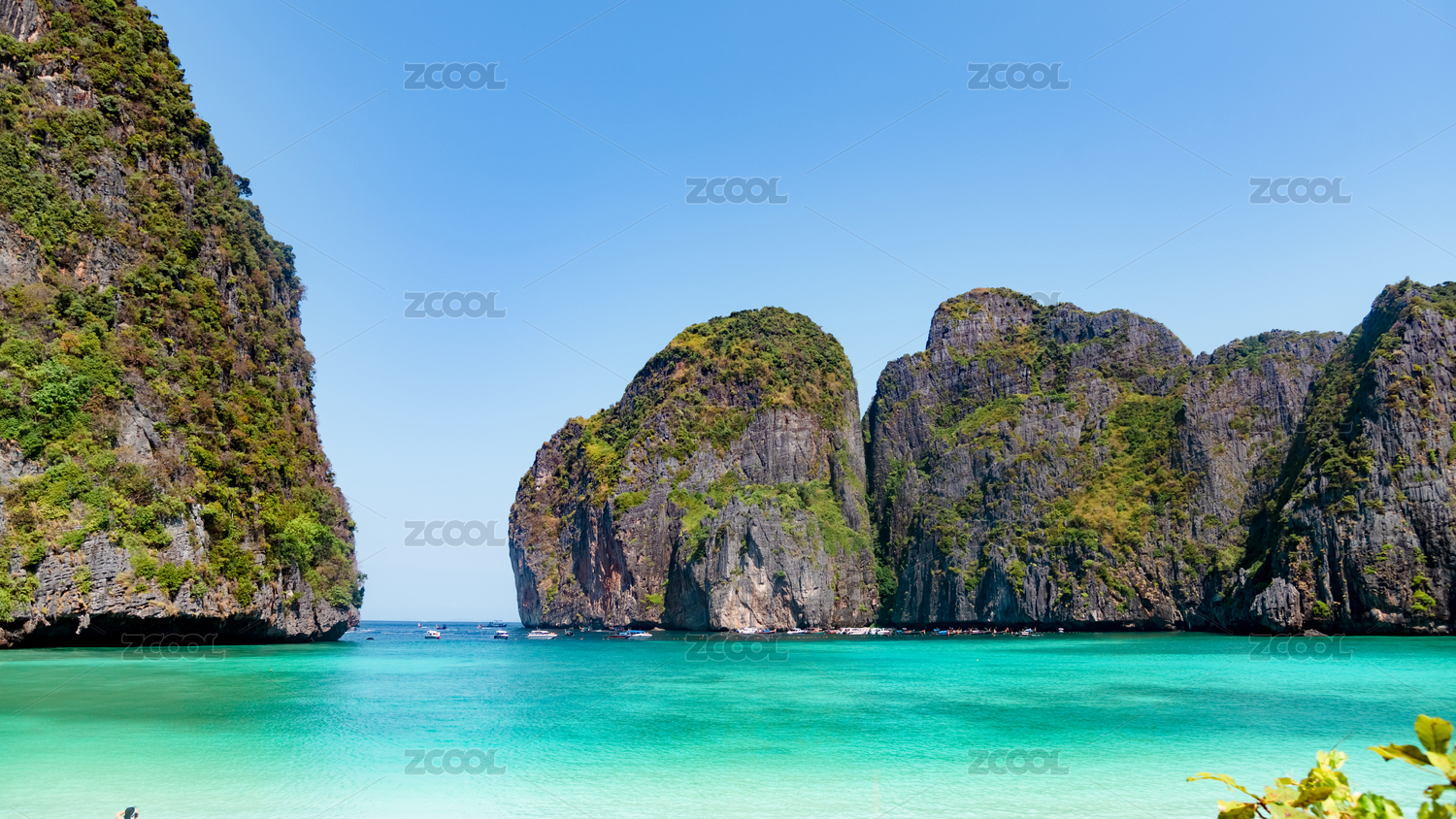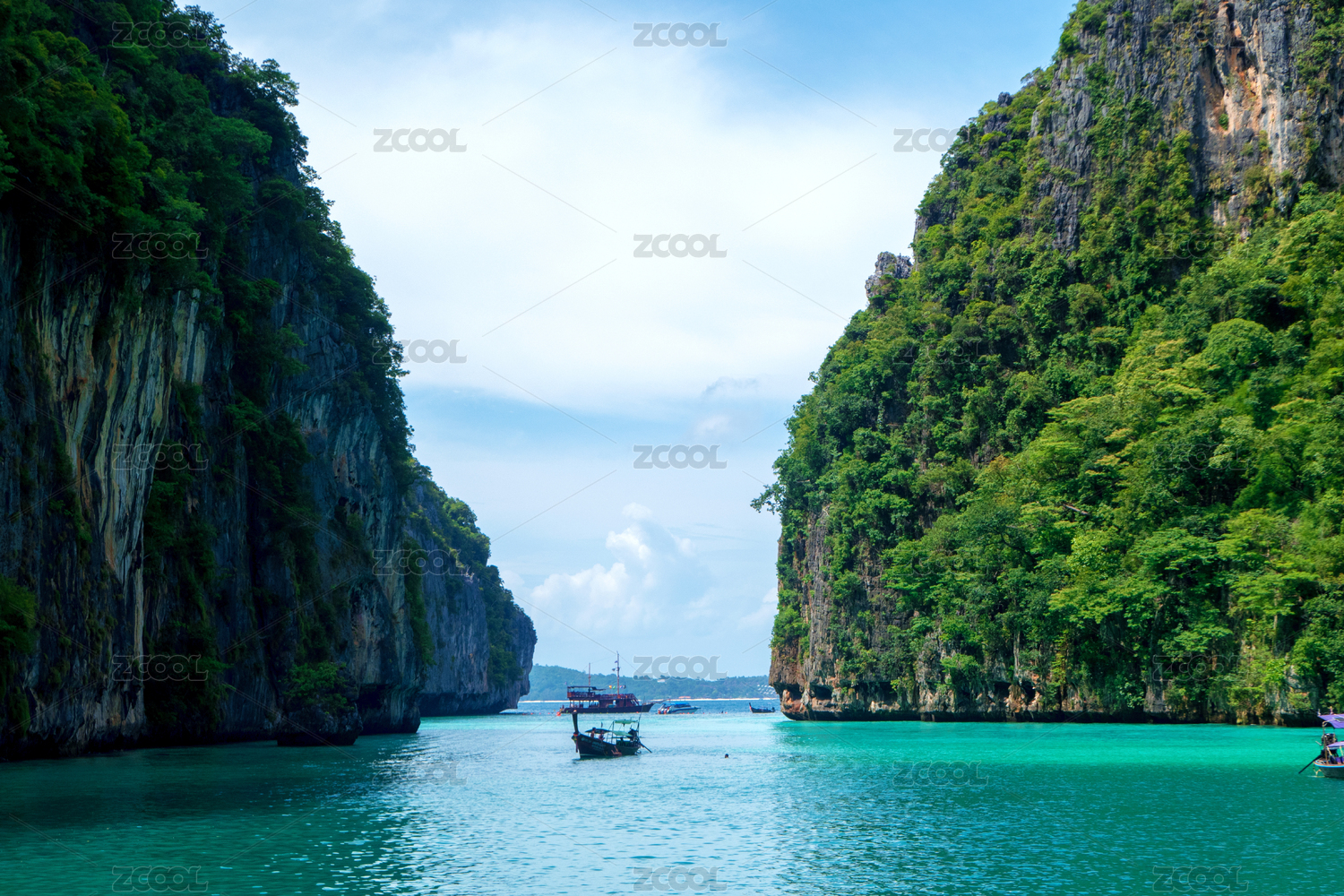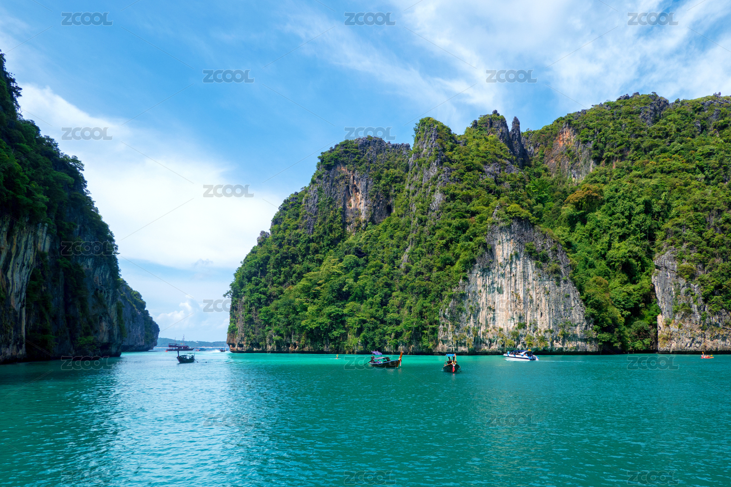 泰国皮皮岛 游船停靠在海边 悬崖下