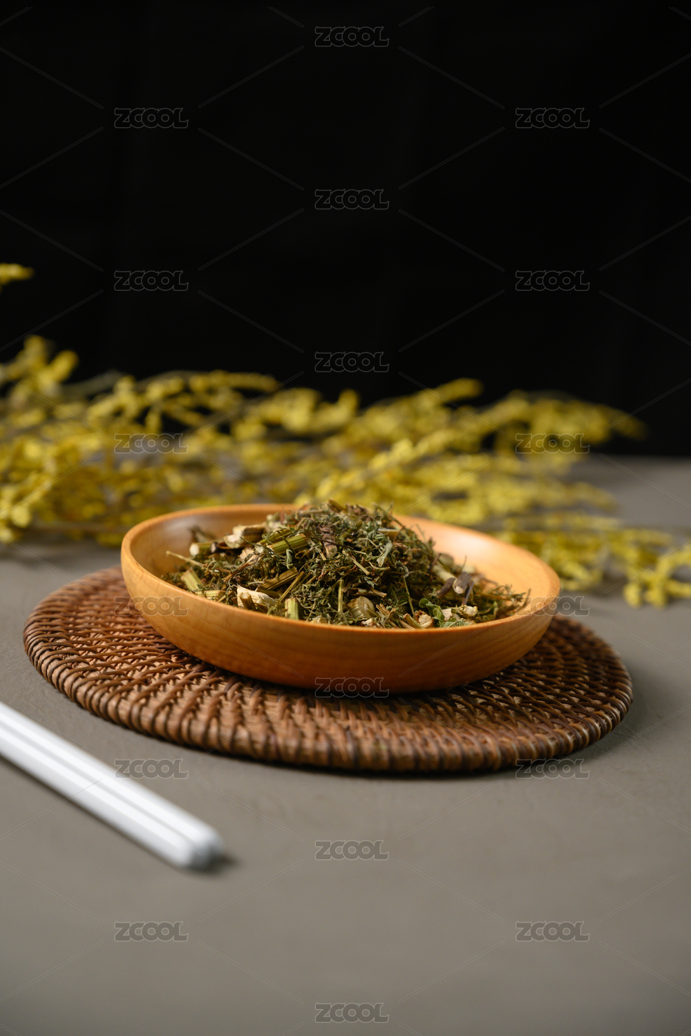 桌面上的盘子里的干爽的青蒿草