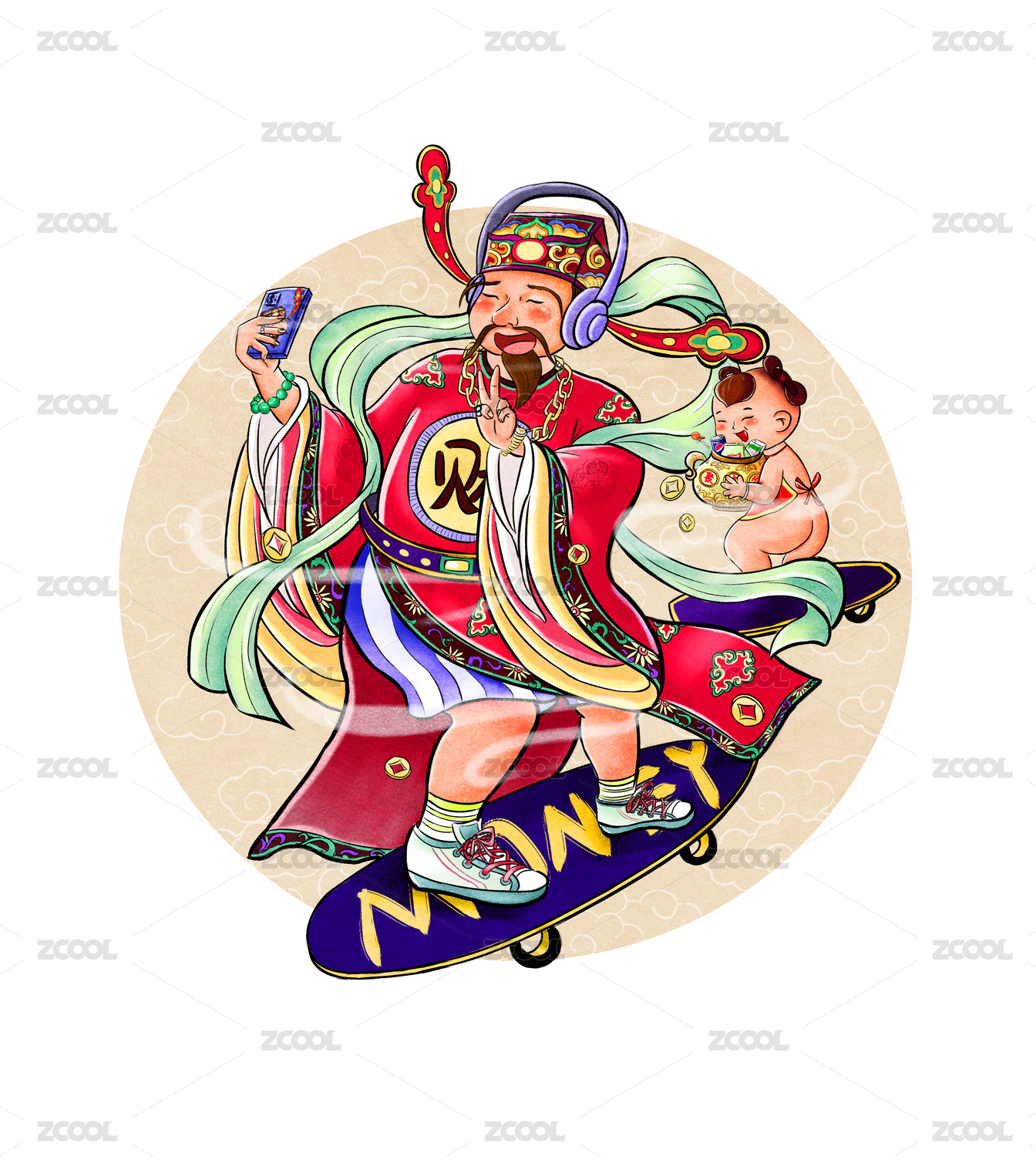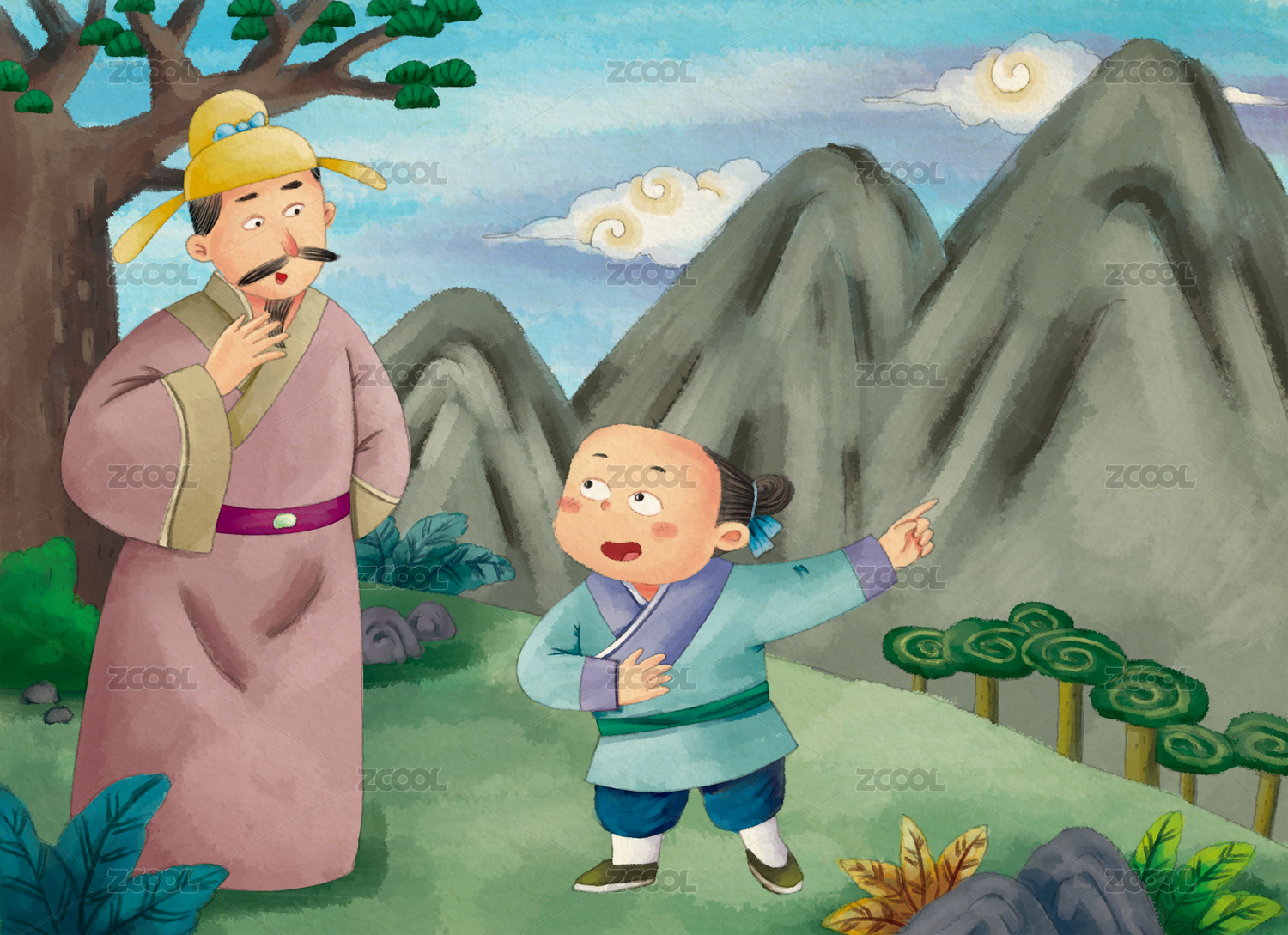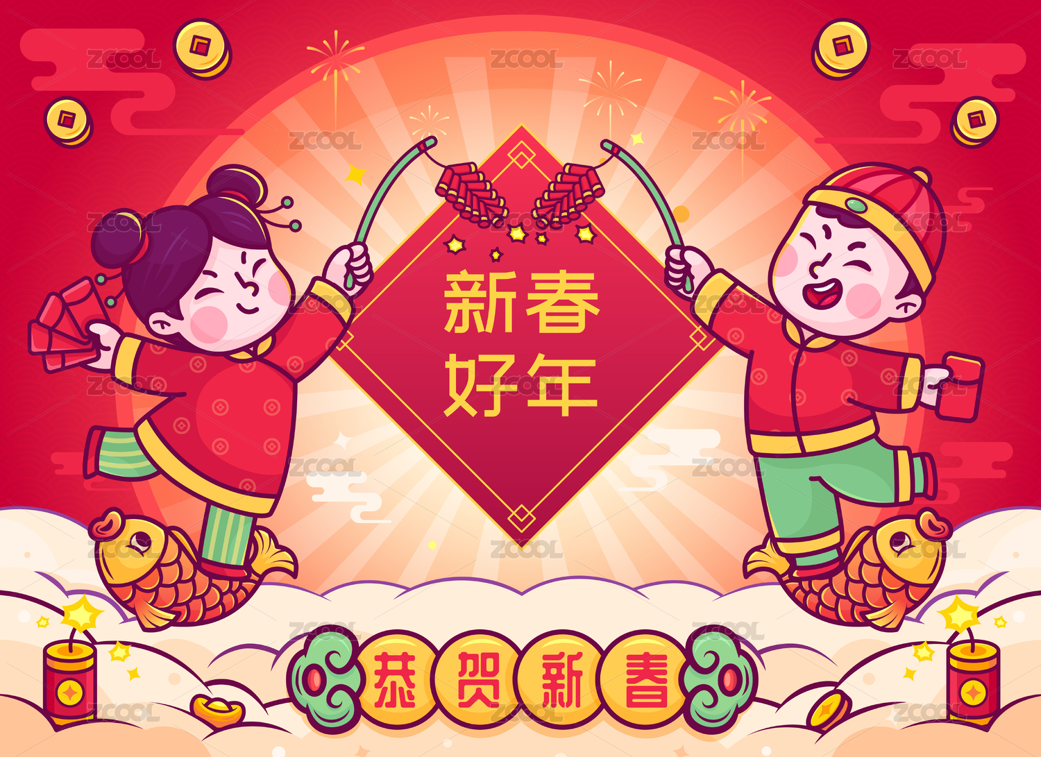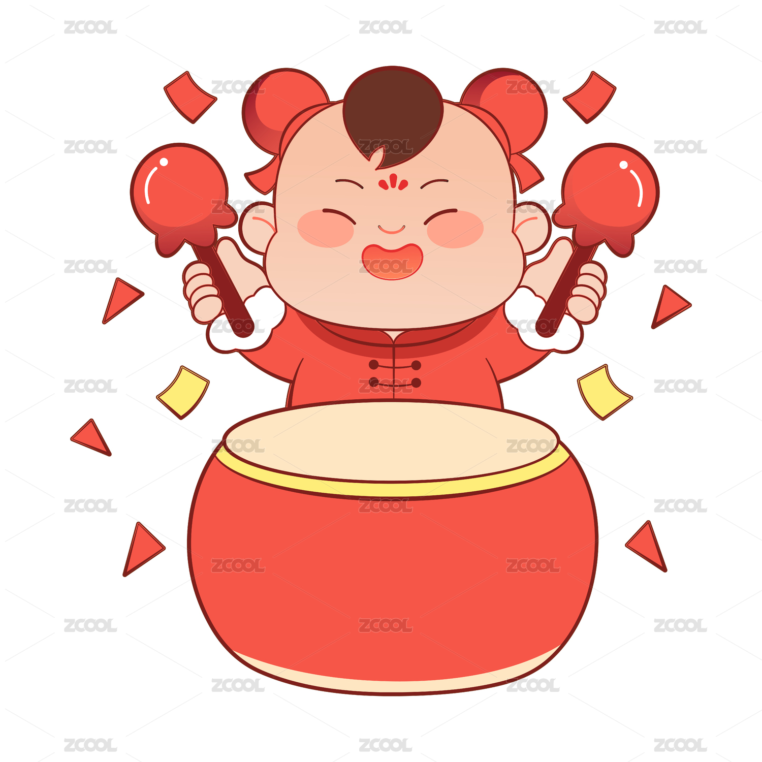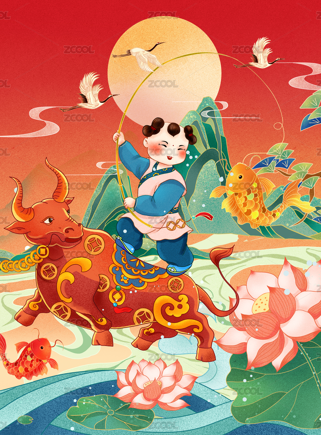 古典莲蓬童子逗趣创意工笔矢量手绘创意插画