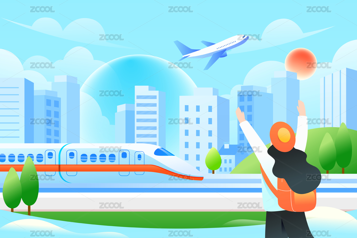 五一劳动节小长假高铁出行城市旅游度假插画