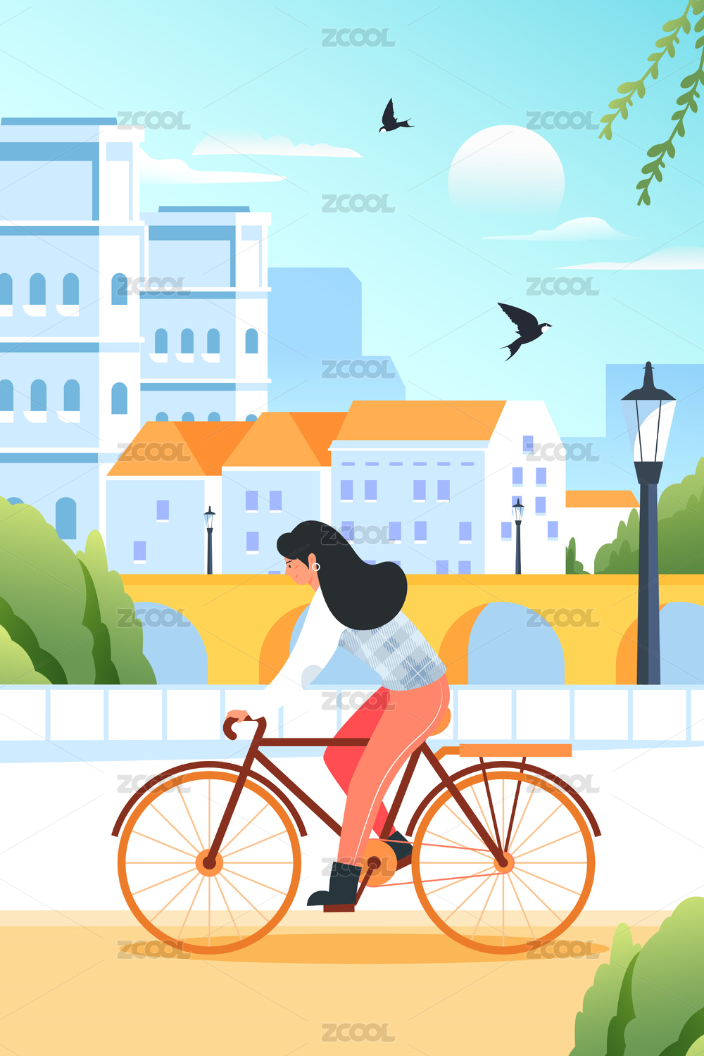 卡通立春出行踏青骑自行车风景背景矢量插画