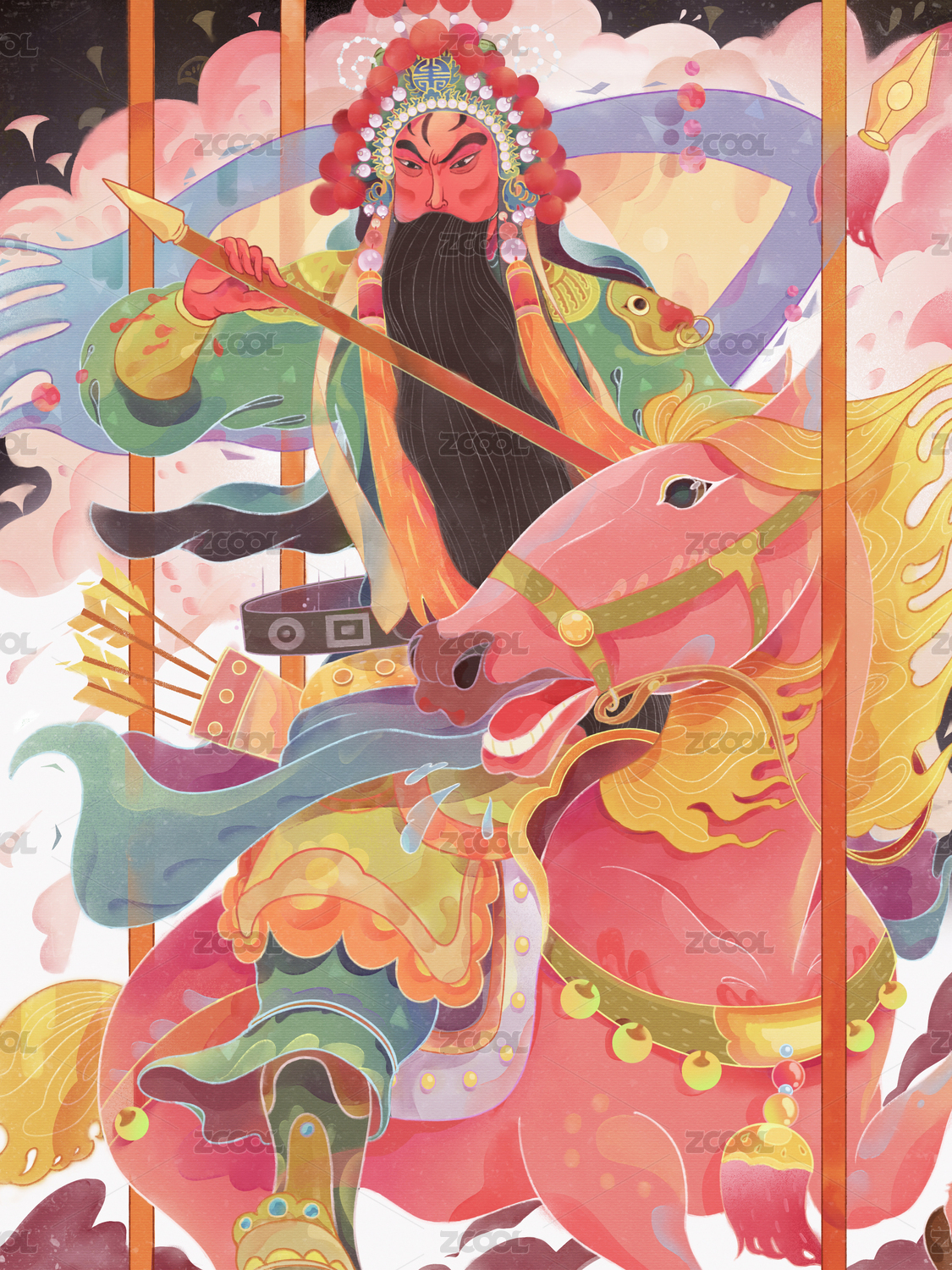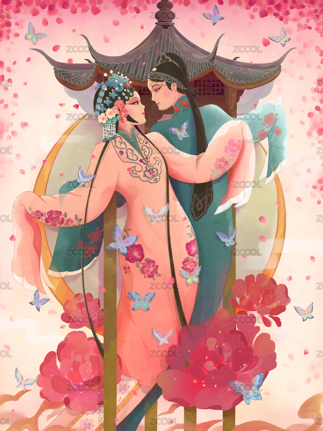 中国风昆曲牡丹亭情人节插画
