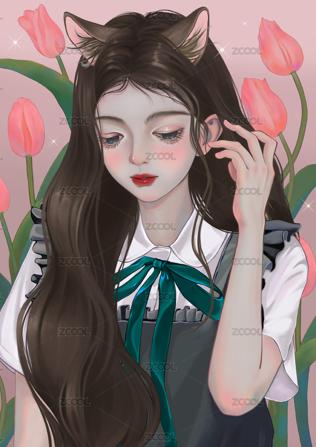 黑色连衣裙长发双马尾绿丝带猫耳少女插画