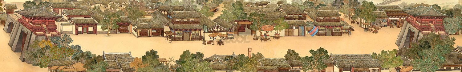 插画手绘风古代商业街店铺及小吃摊城楼日景