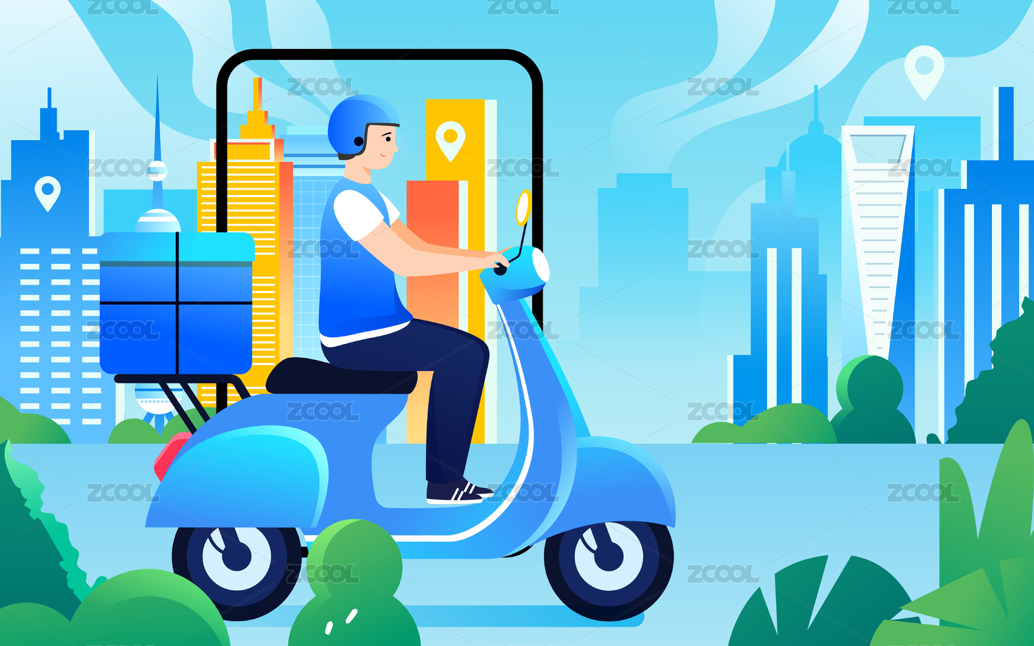 互联网商务购物快递员送货物流运输骑行插画