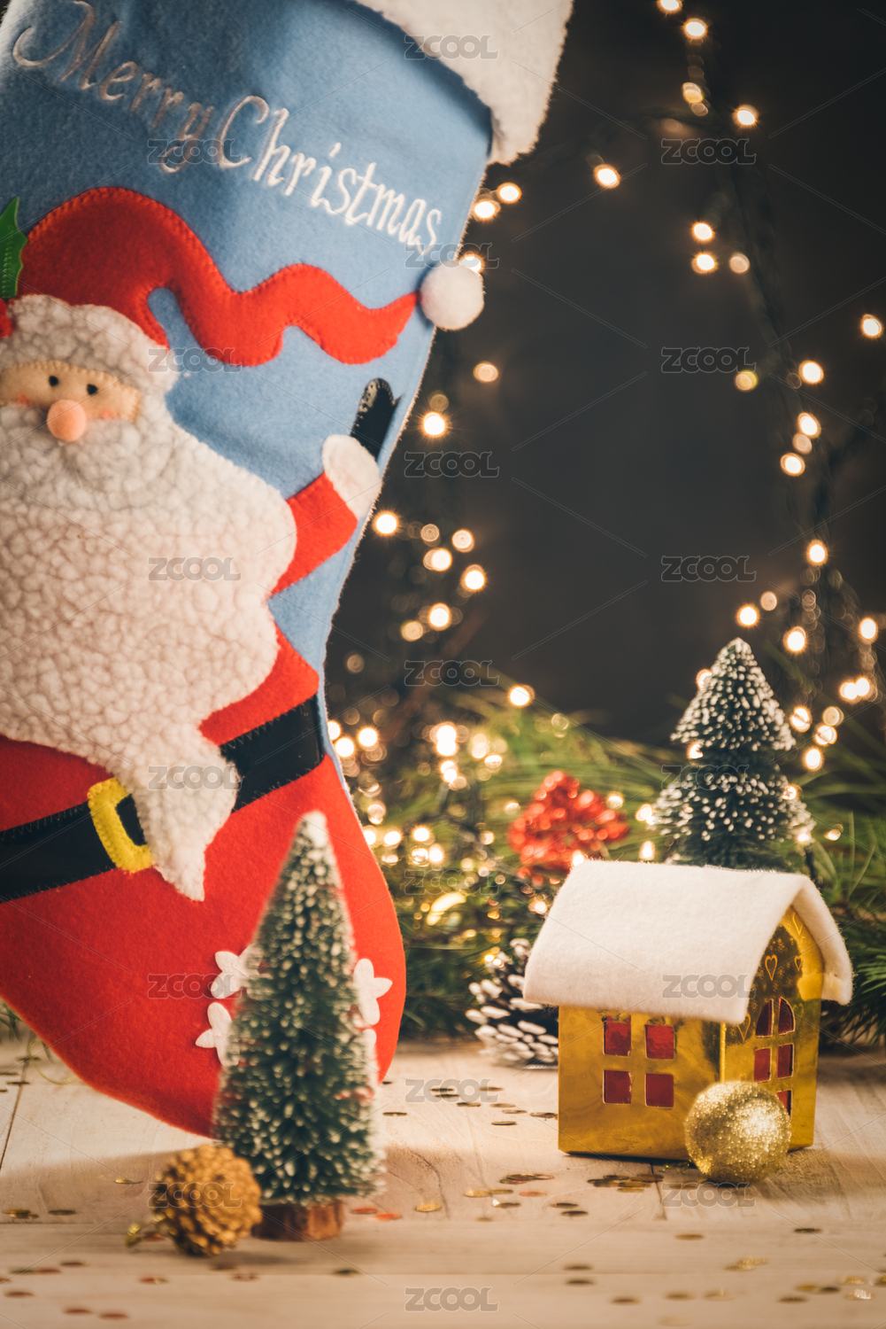 圣诞装饰品大圣诞袜和小玩具屋。
