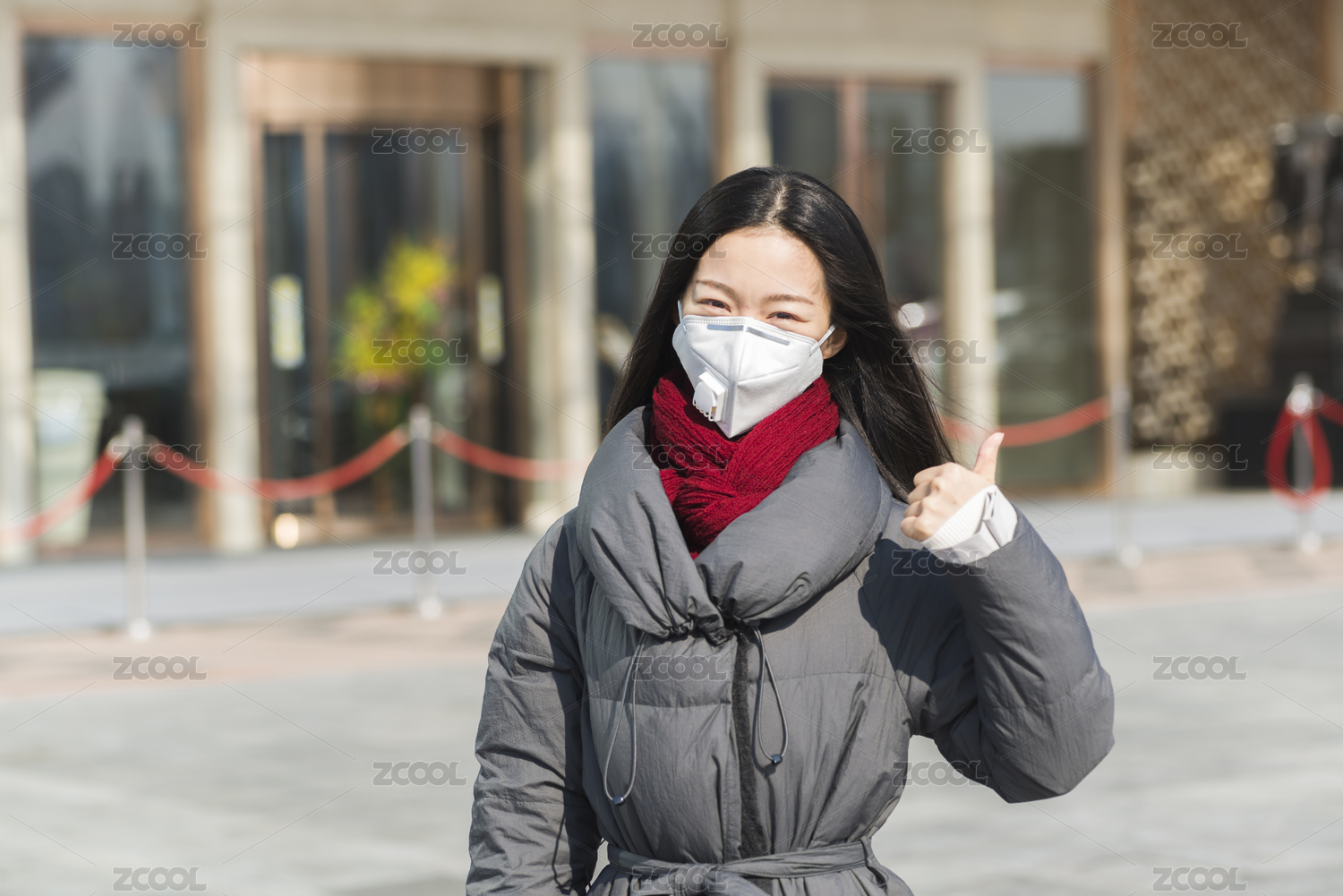 酒店门前戴口罩女孩赞扬手势