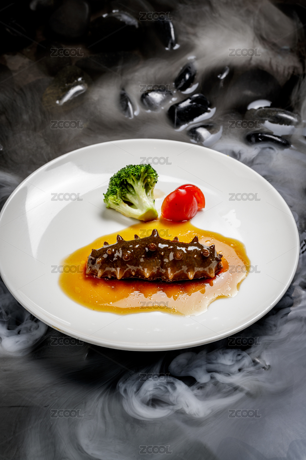 鲍汁扣辽参摆放在干冰缭绕的水中