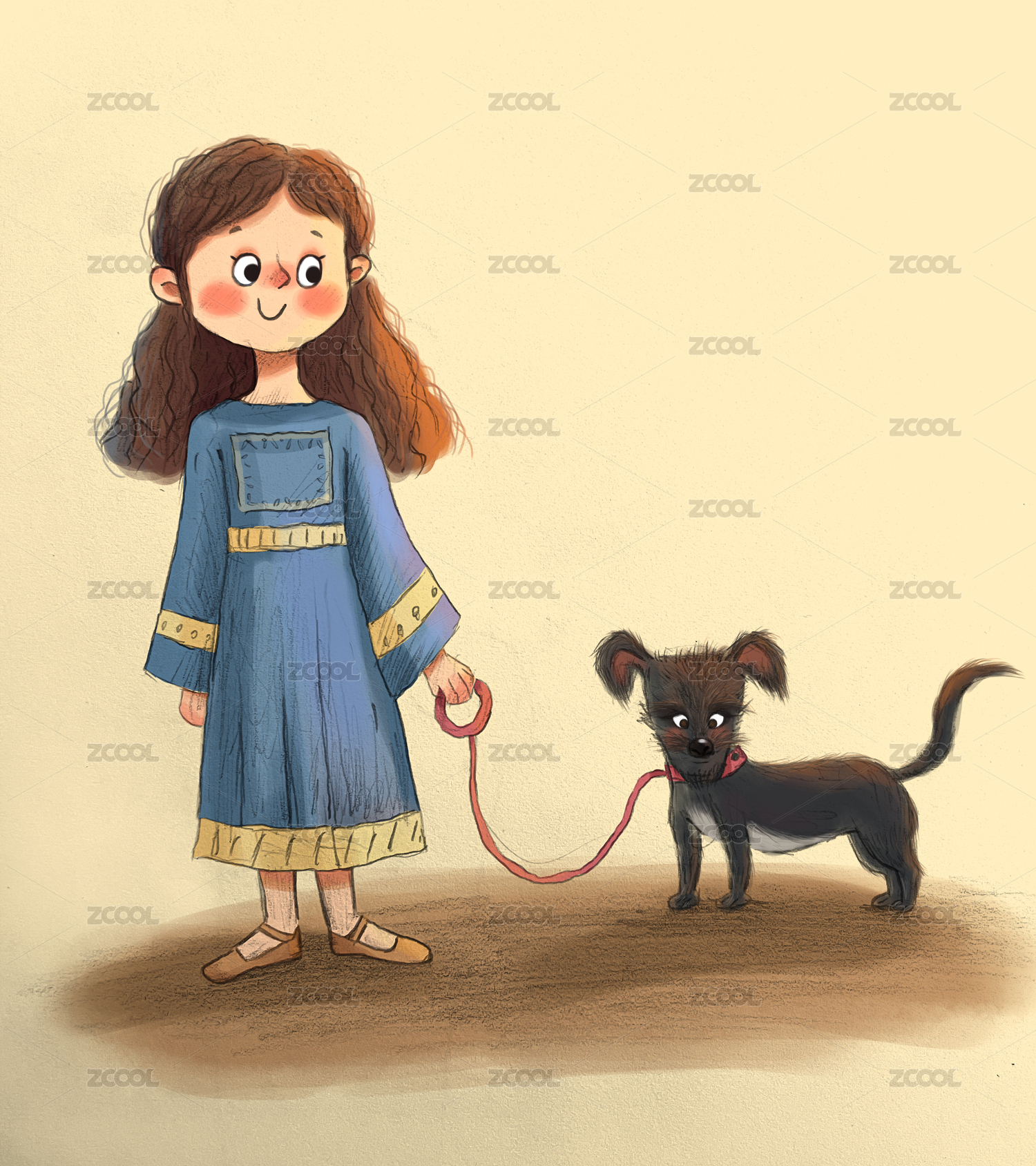 手绘遛狗的小女孩