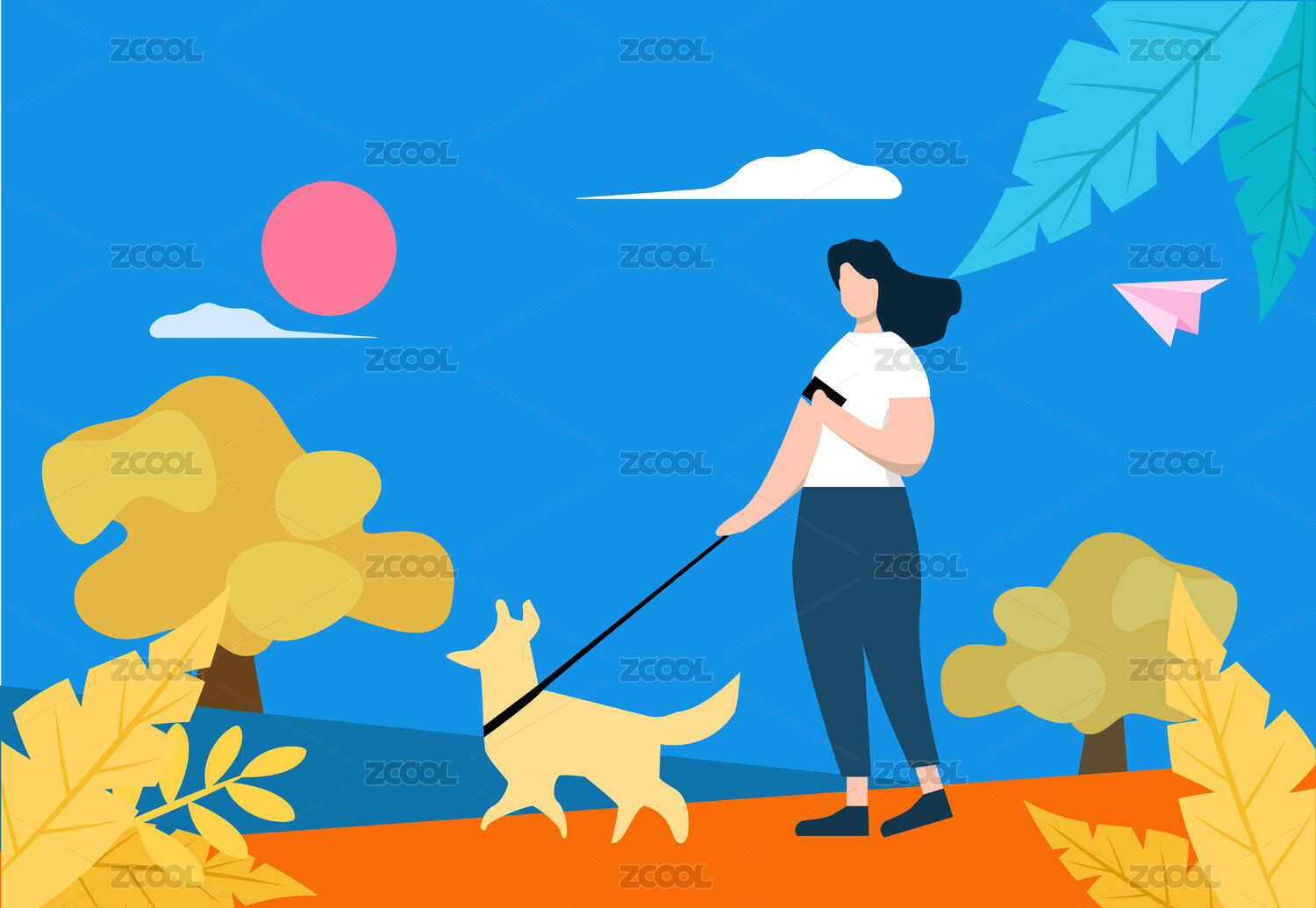 女人牵绳遛狗插画