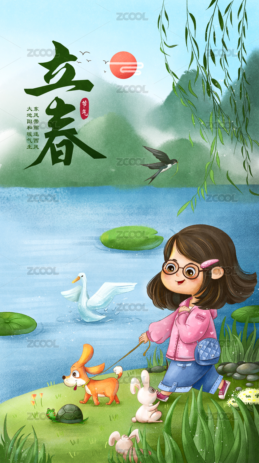 立春,遛狗的小女孩