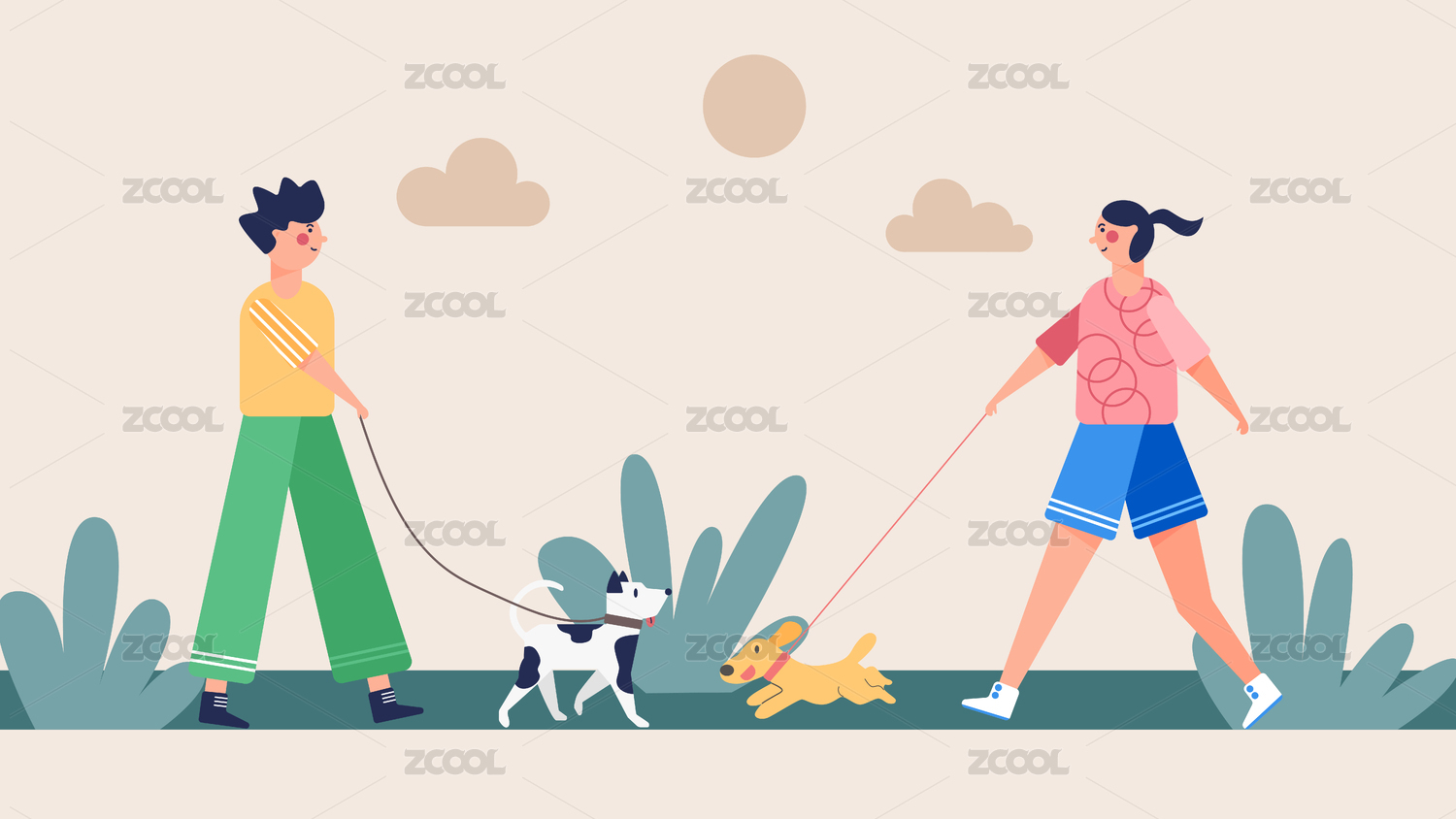 户外遛狗萌宠扁平矢量人物动物