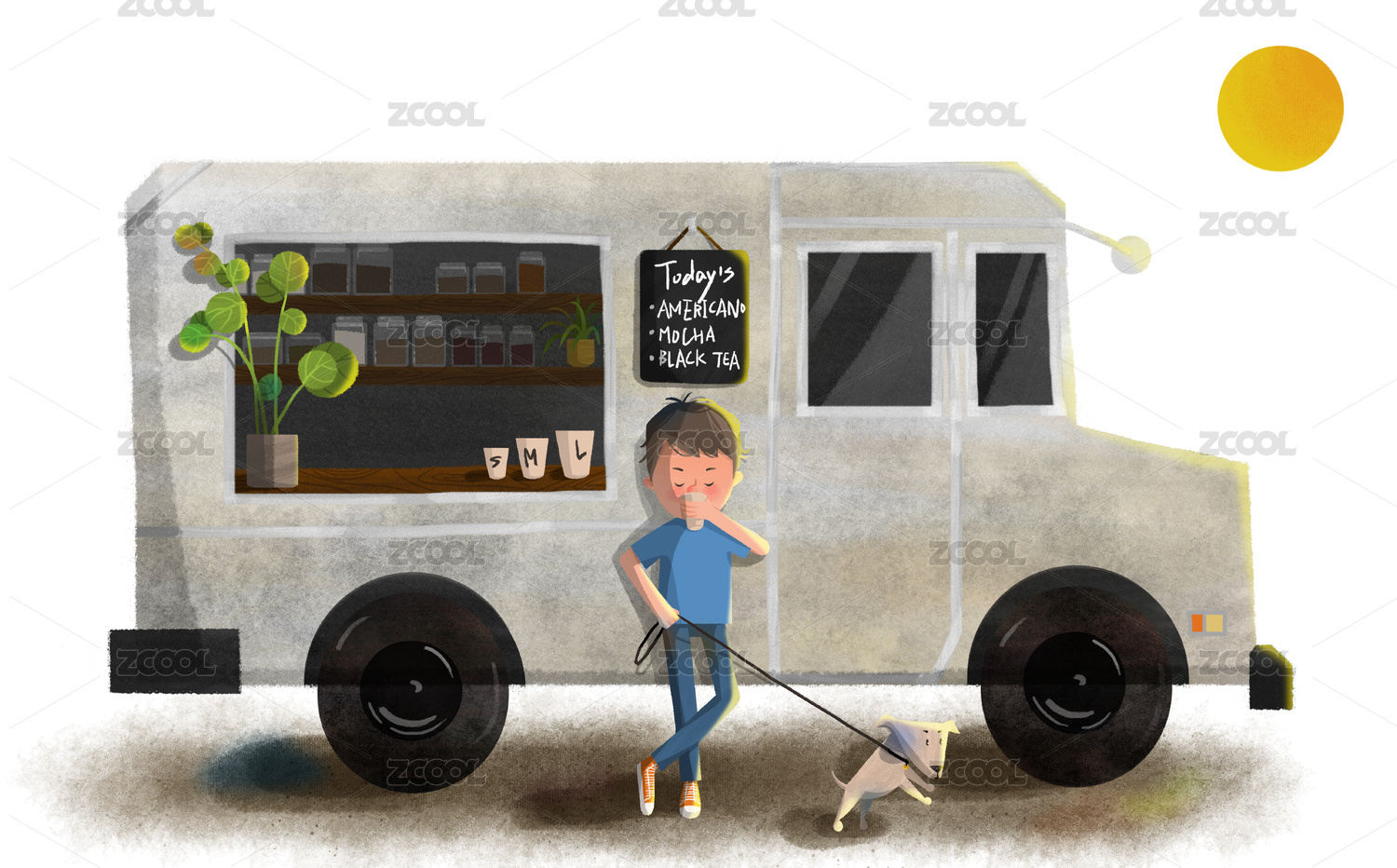 男孩遛狗时喝杯咖啡休息 插画