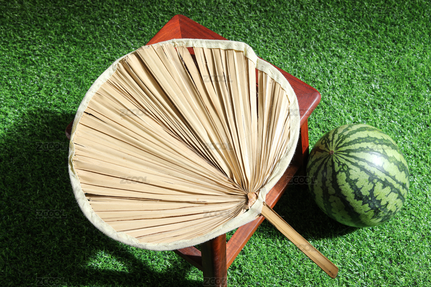 夏天绿色草坪上摆放着的新鲜水果西瓜和蒲扇