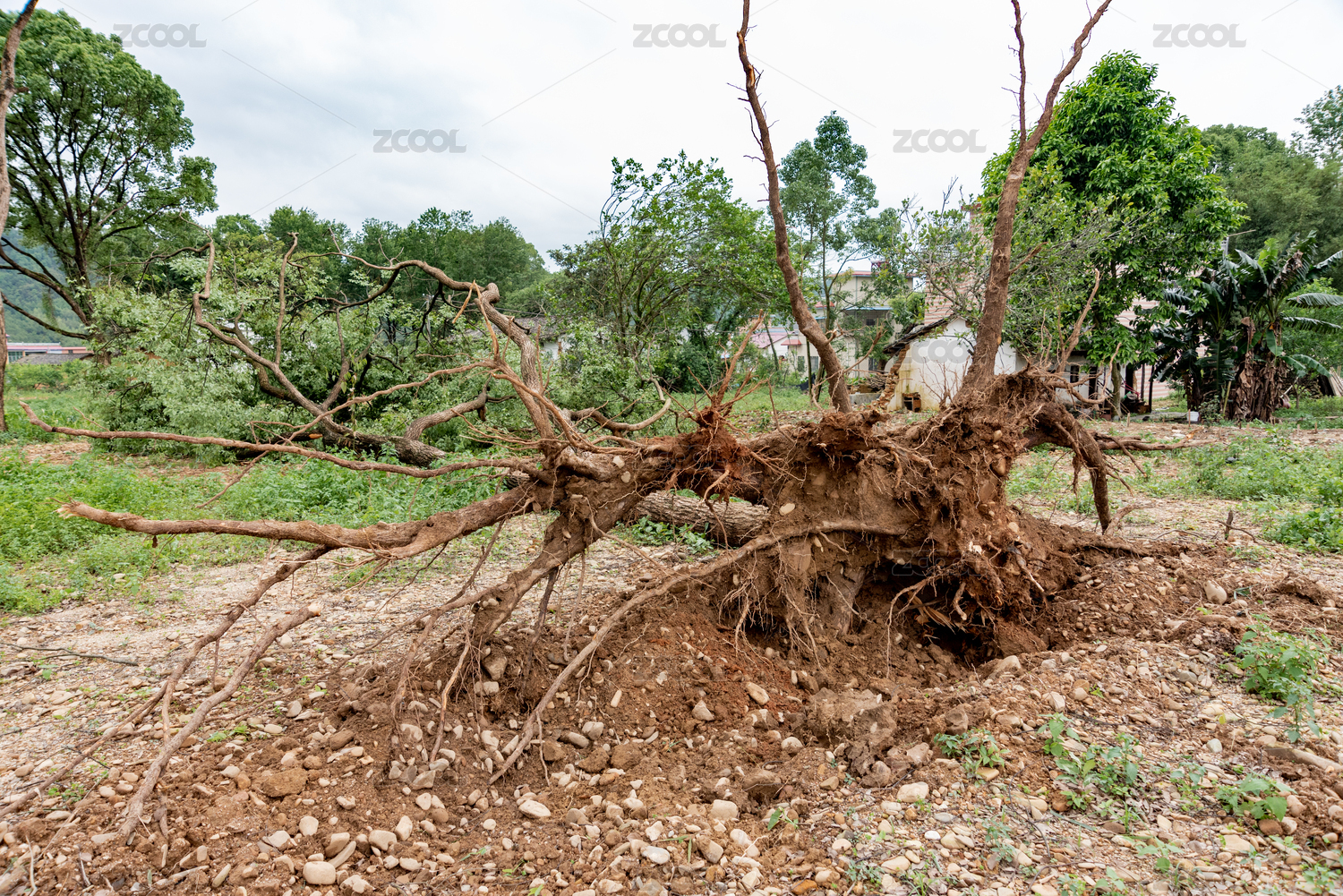 广东省韶关市翁源县台风暴雨风灾雨灾水灾灾难过后田间农村村子边被大风吹倒的大树树木
