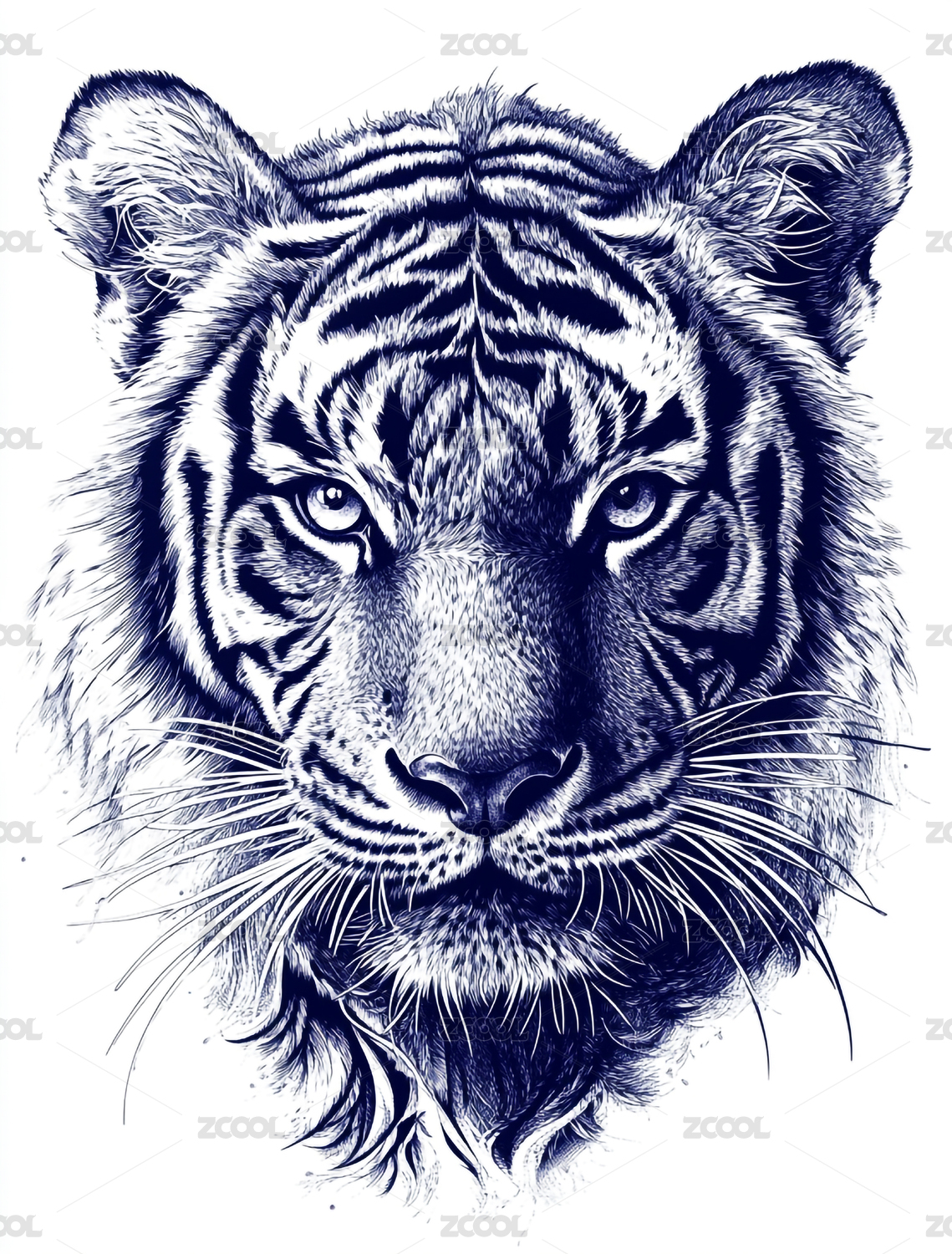 线稿版画风格老虎头部徽章装饰印花插画图案