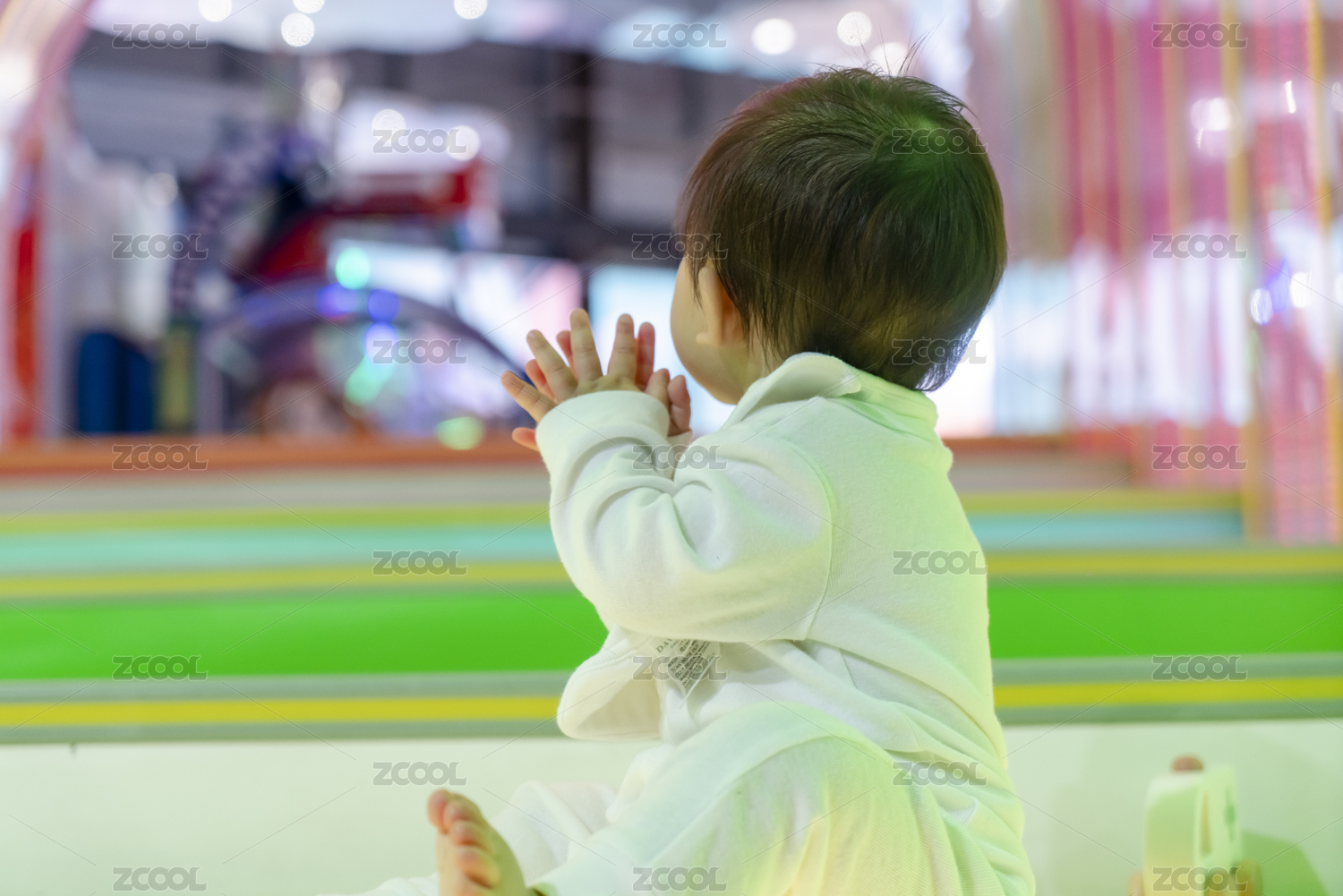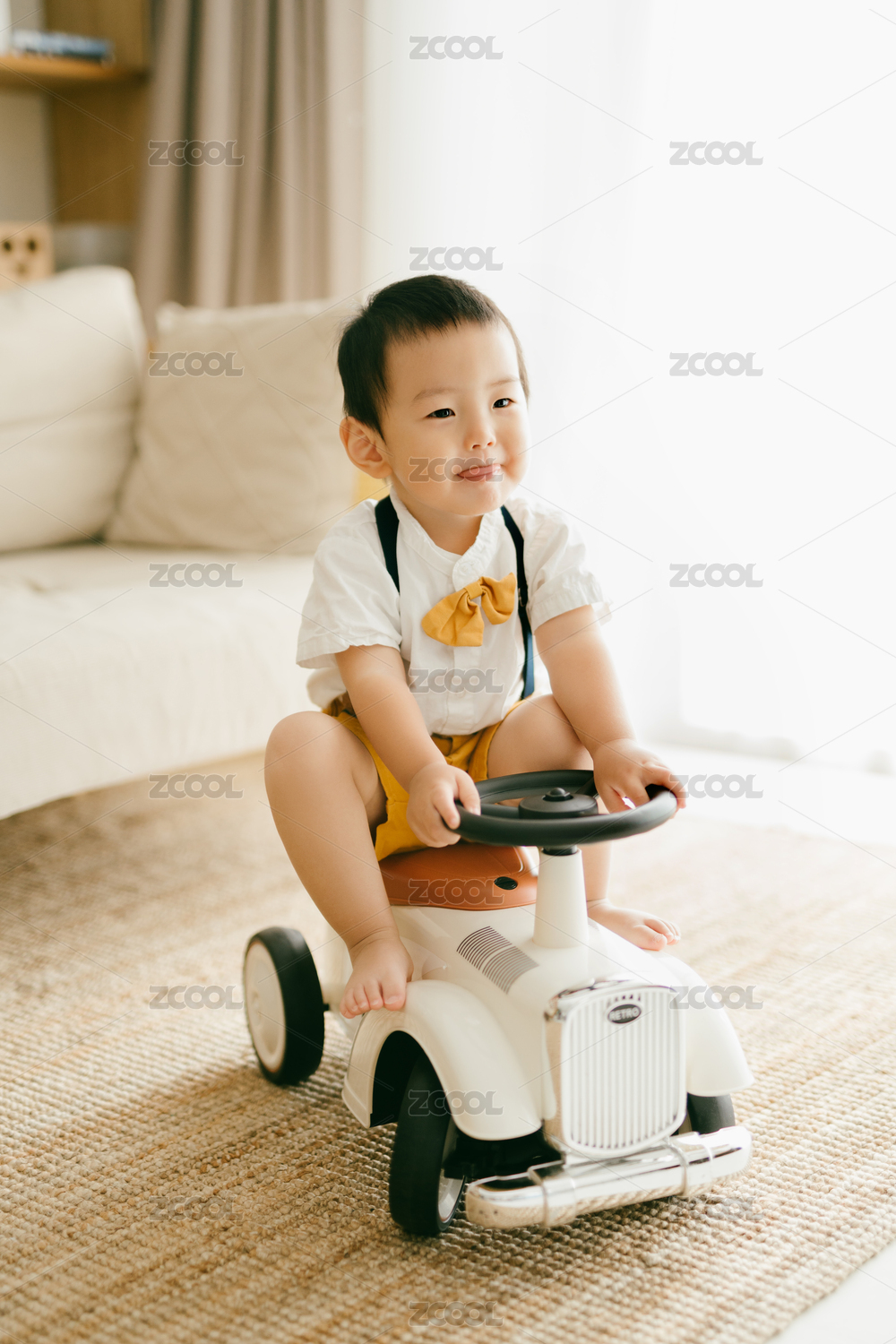 宝宝在家里的木地板上玩着玩具遥控汽车